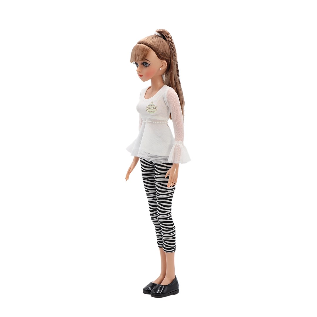 Muñeca de vinil, pantalón estampado rayas, blusa blanca, rubia y flats negros