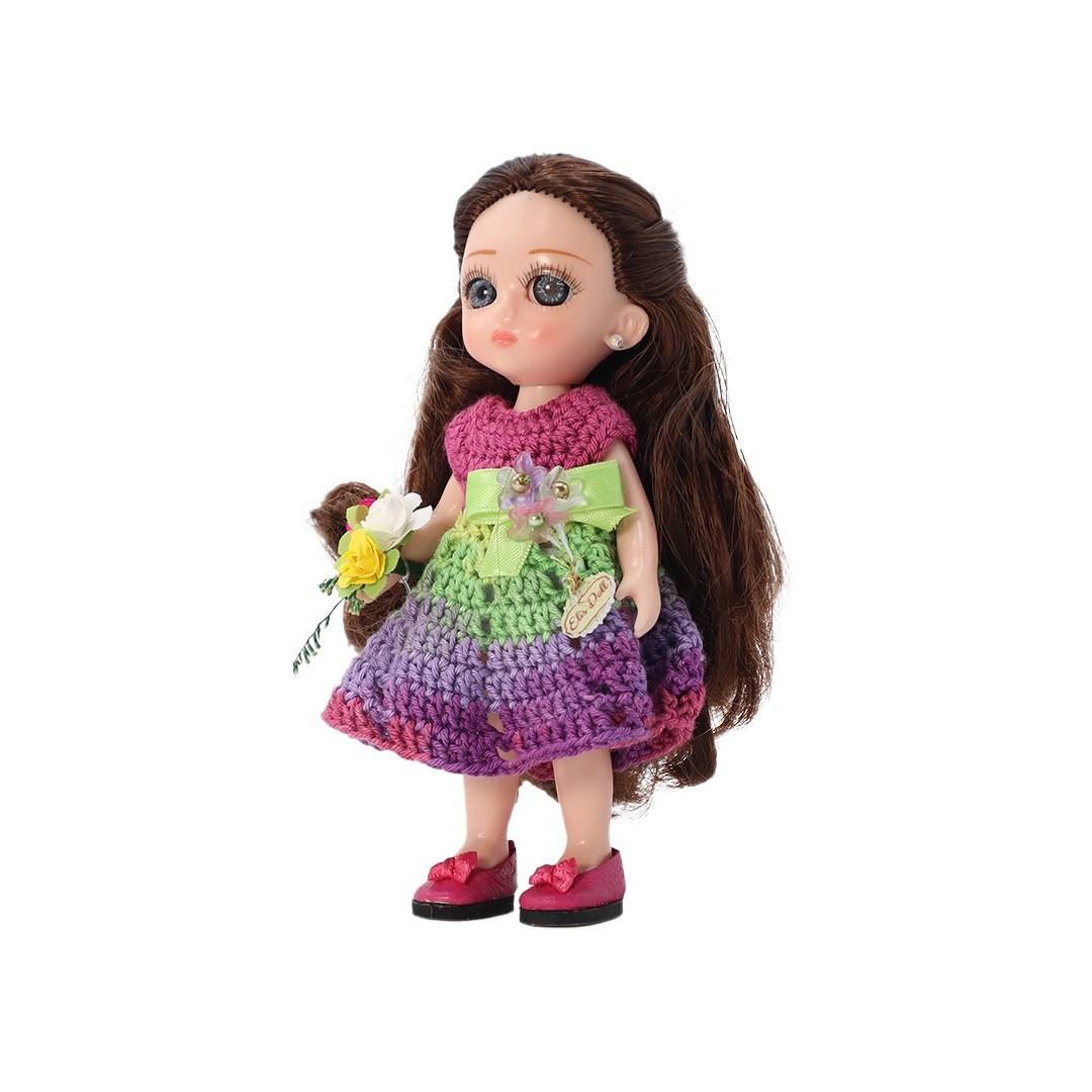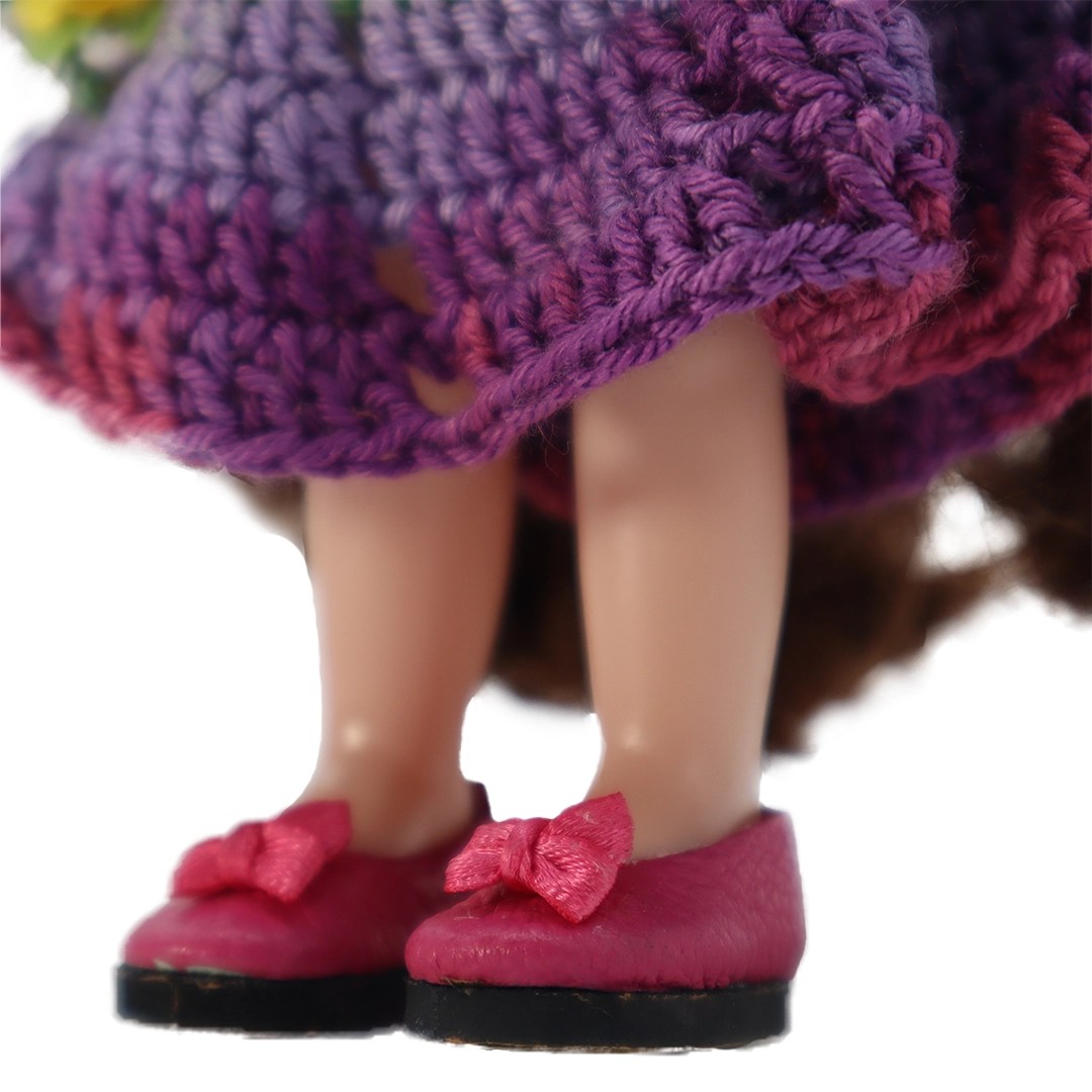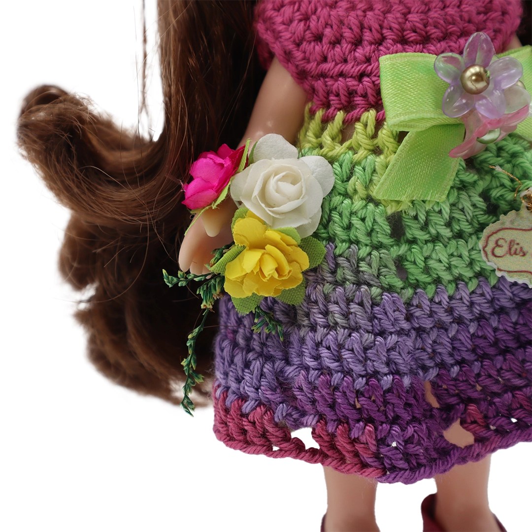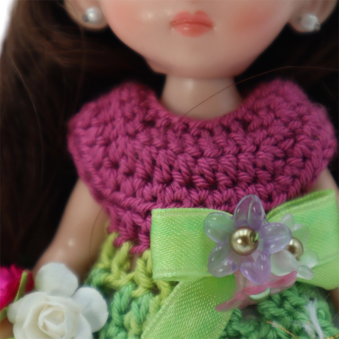 Muñeca Vestido y diadema tejidos bugambilia / verde, ramo y flats fiusha