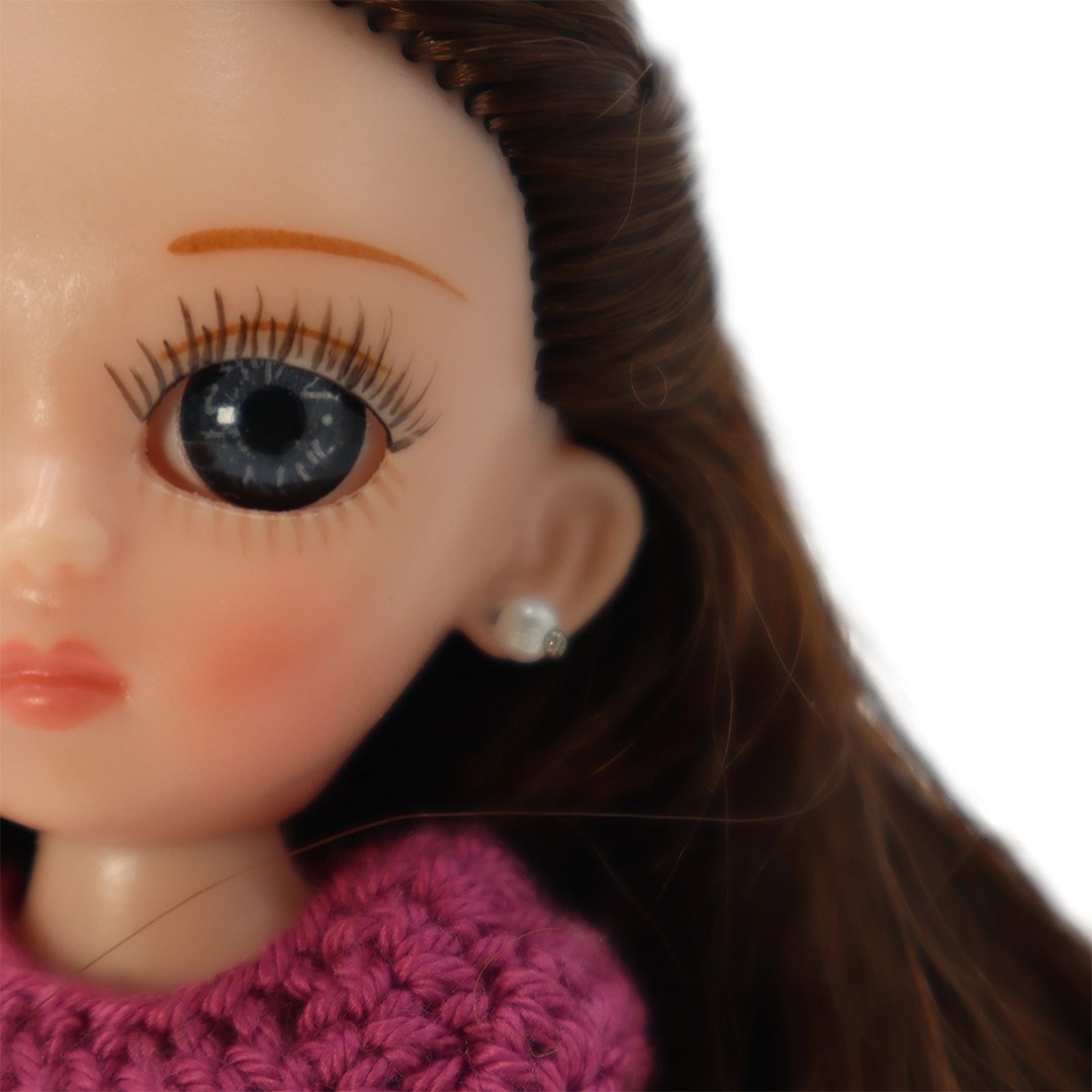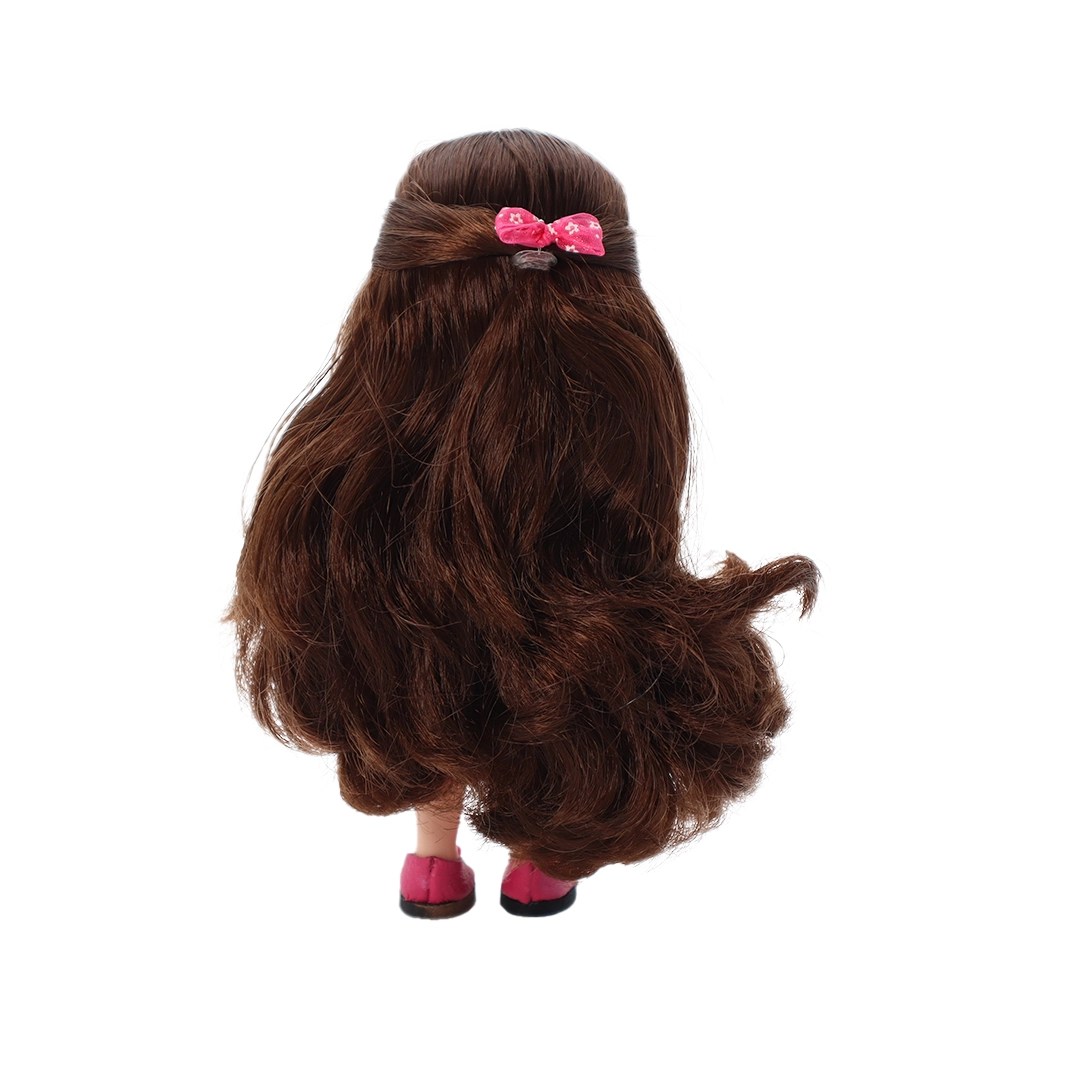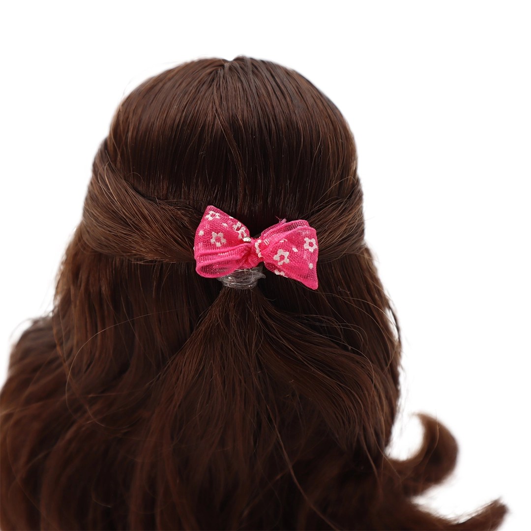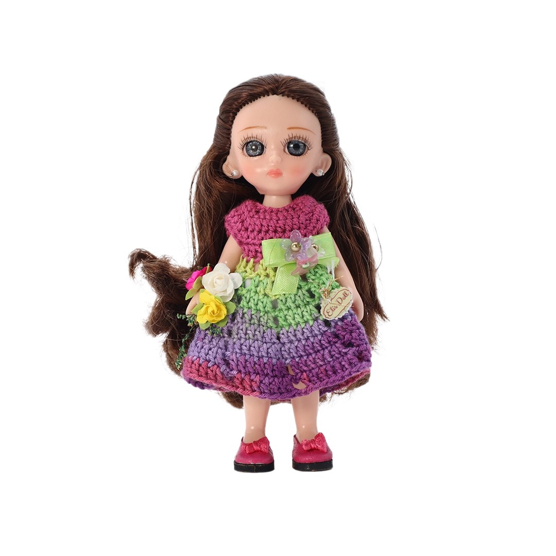 Muñeca Vestido y diadema tejidos bugambilia / verde, ramo y flats fiusha
