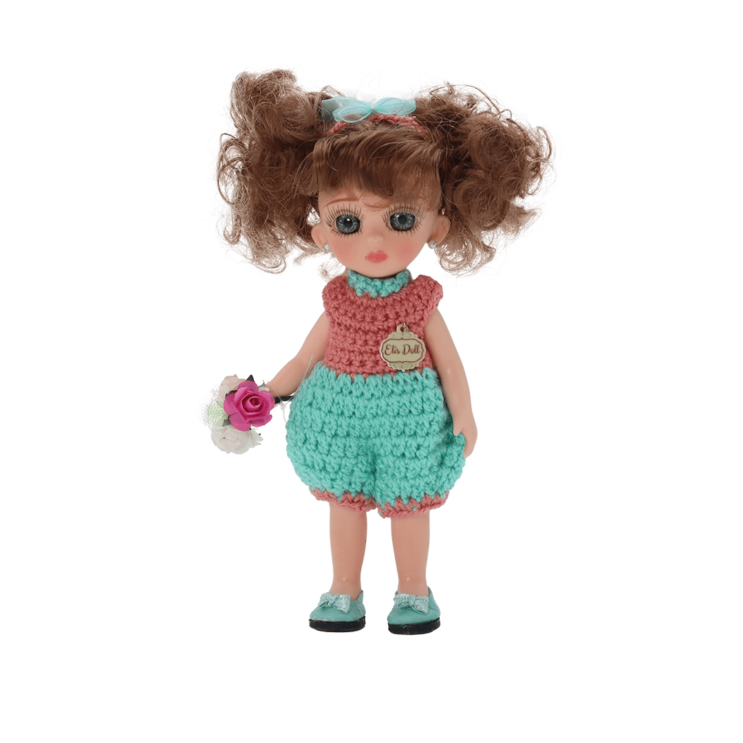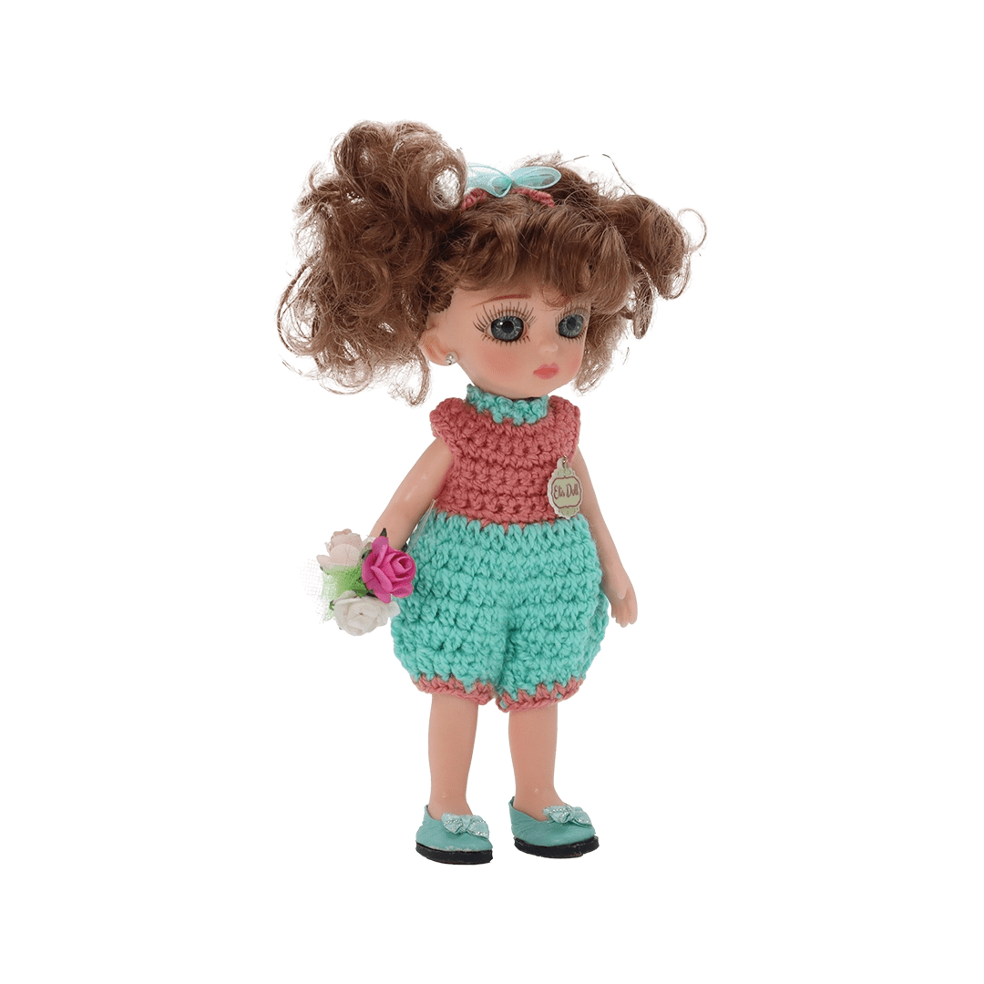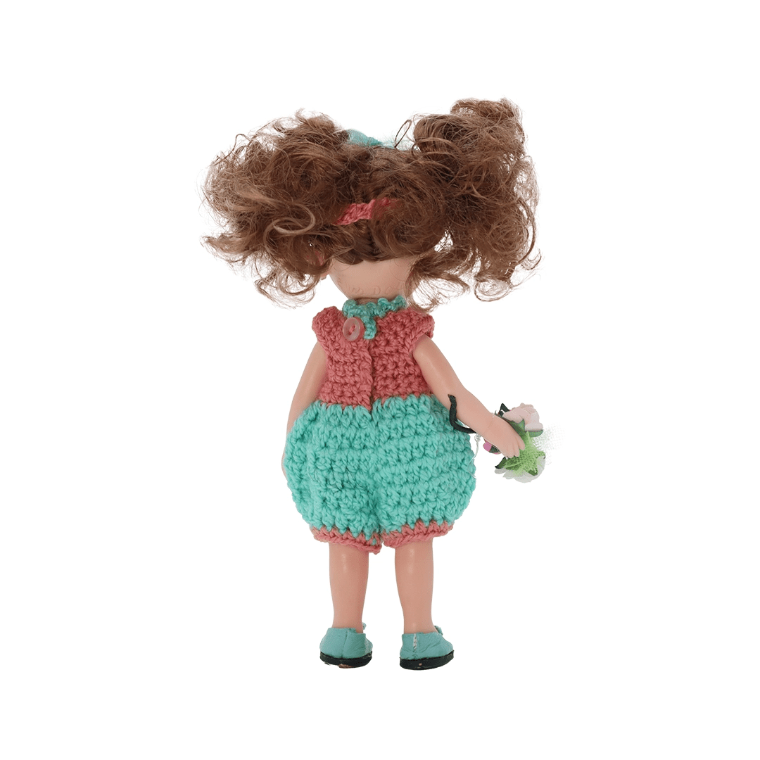 Muñeca de vinil, jumper y diadema tejidos coral/menta y flats menta