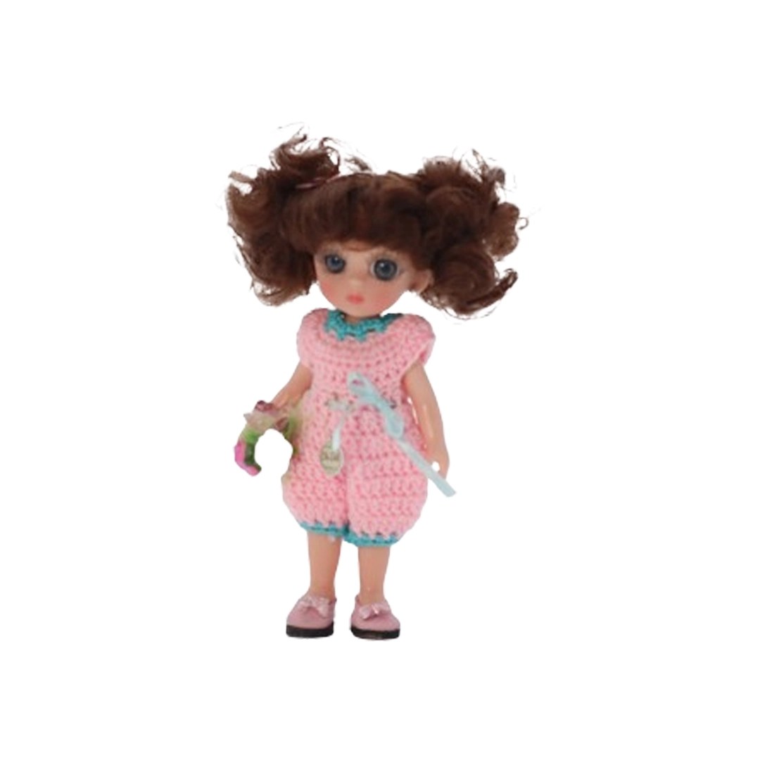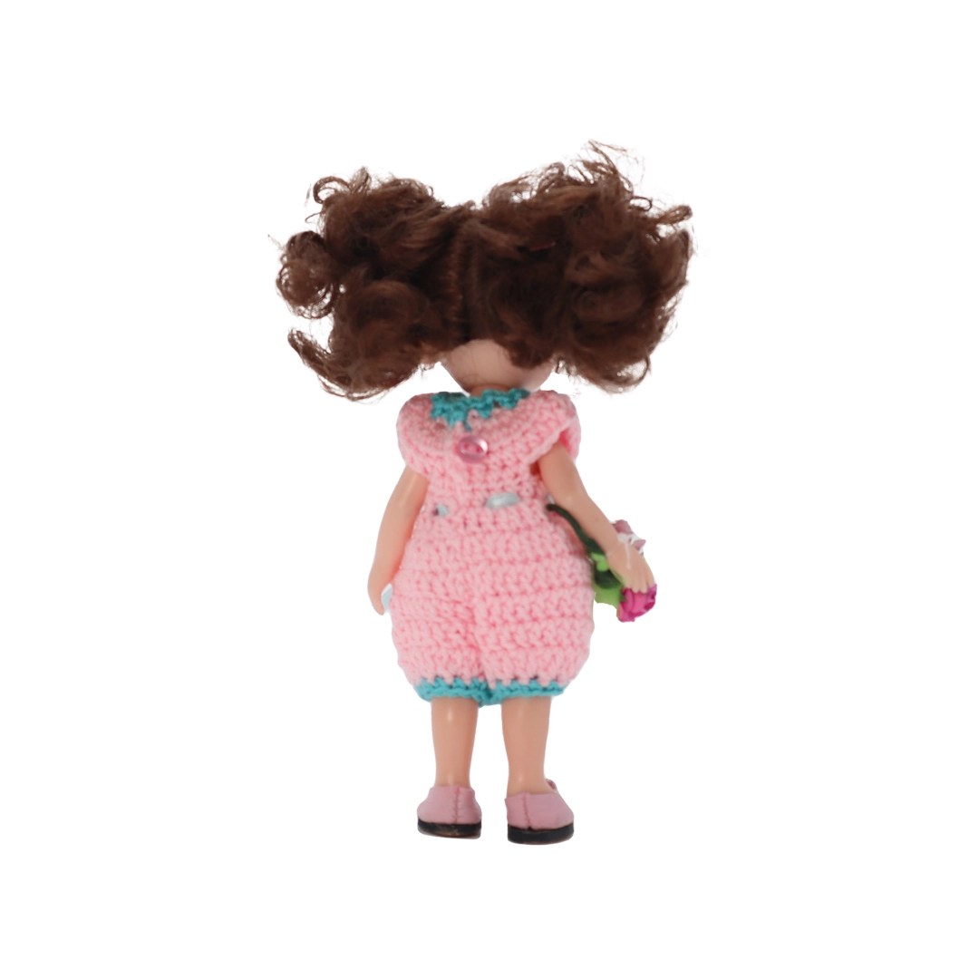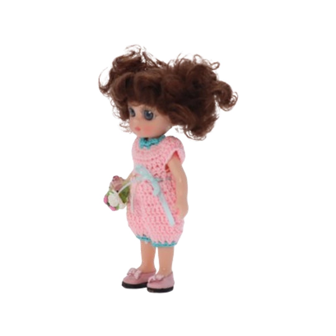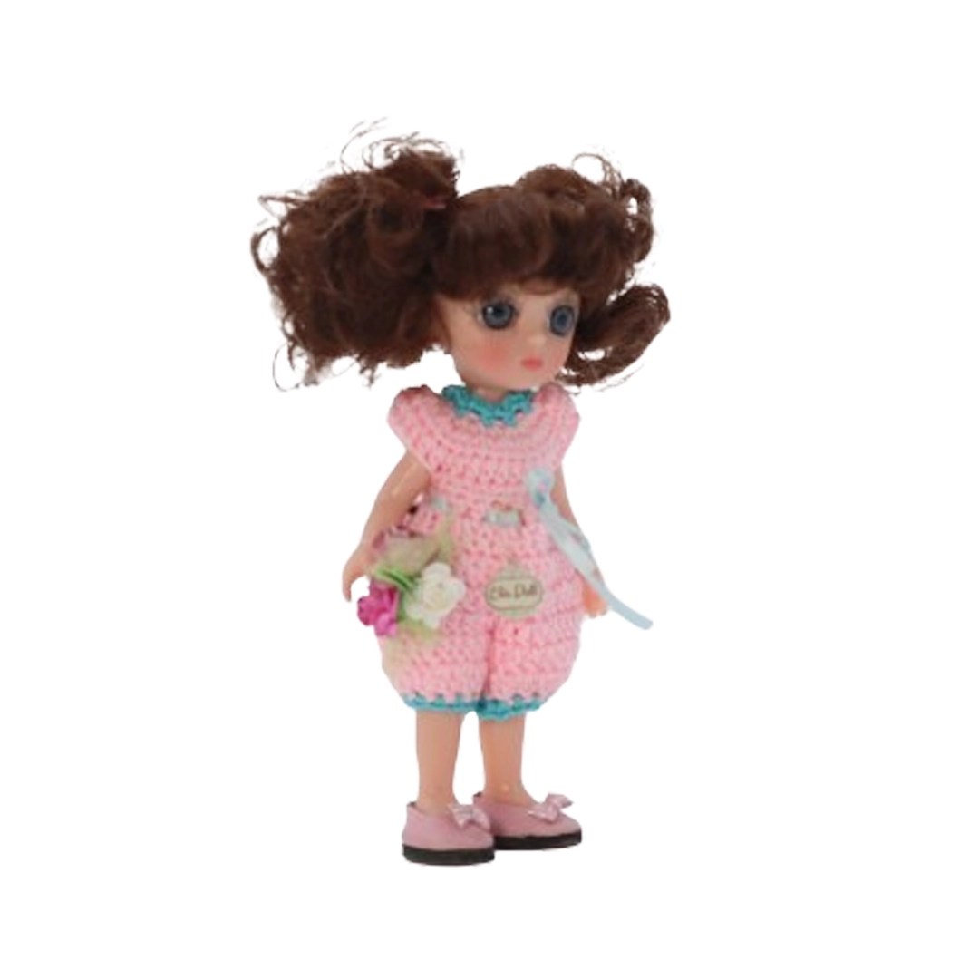 Muñeca de vinil, jumper tejido rosa/escarola menta, moño y flats rosa