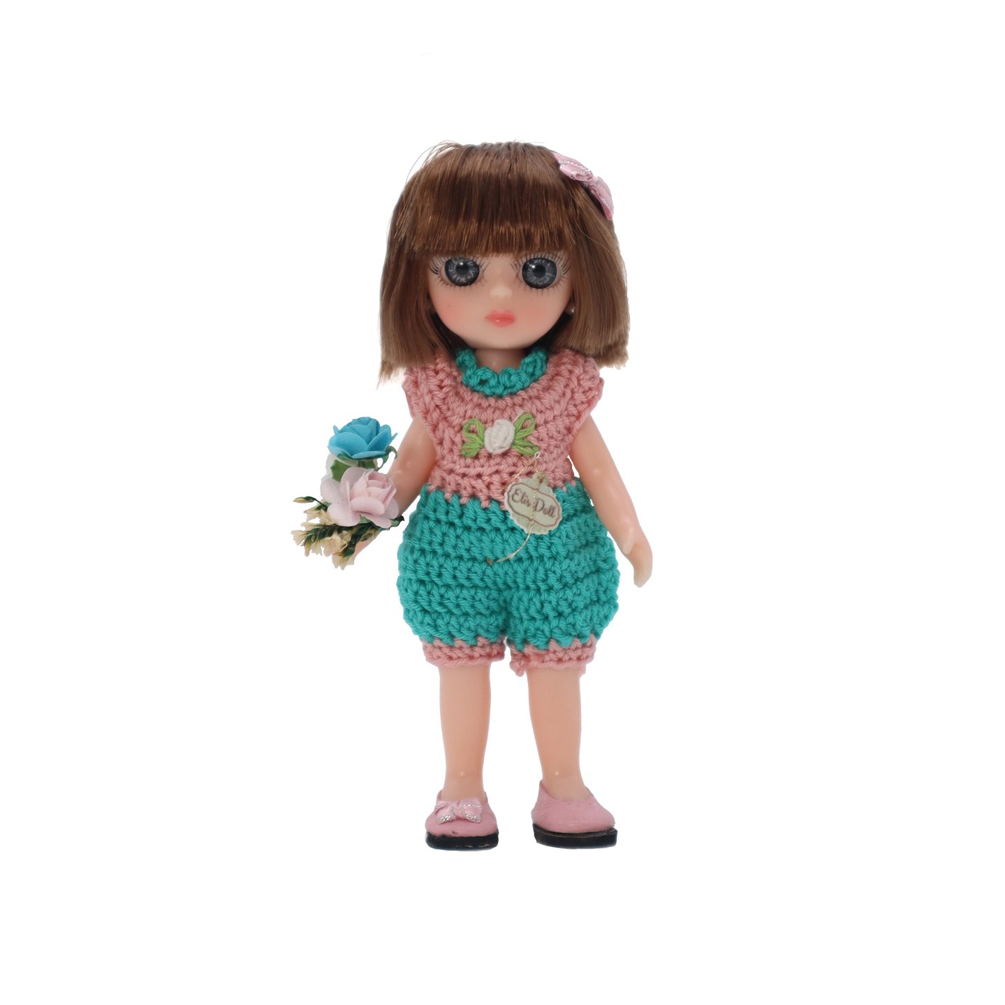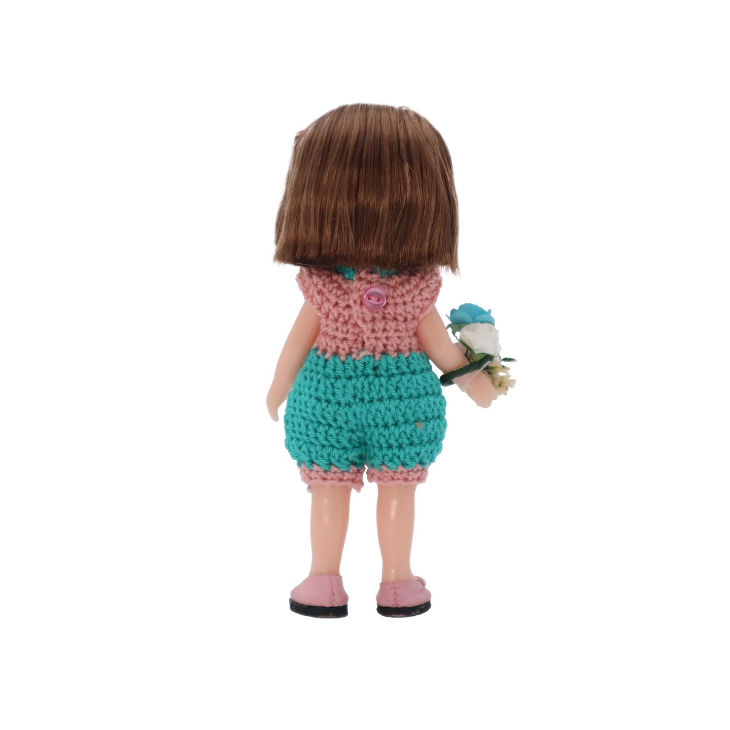 Muñeca de vinil, jumper tejido rococó rosa/menta, moño y flats rosa