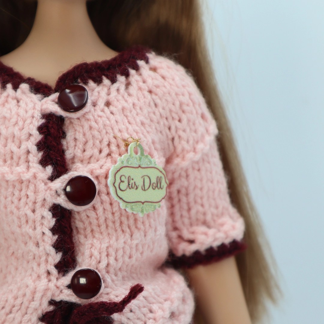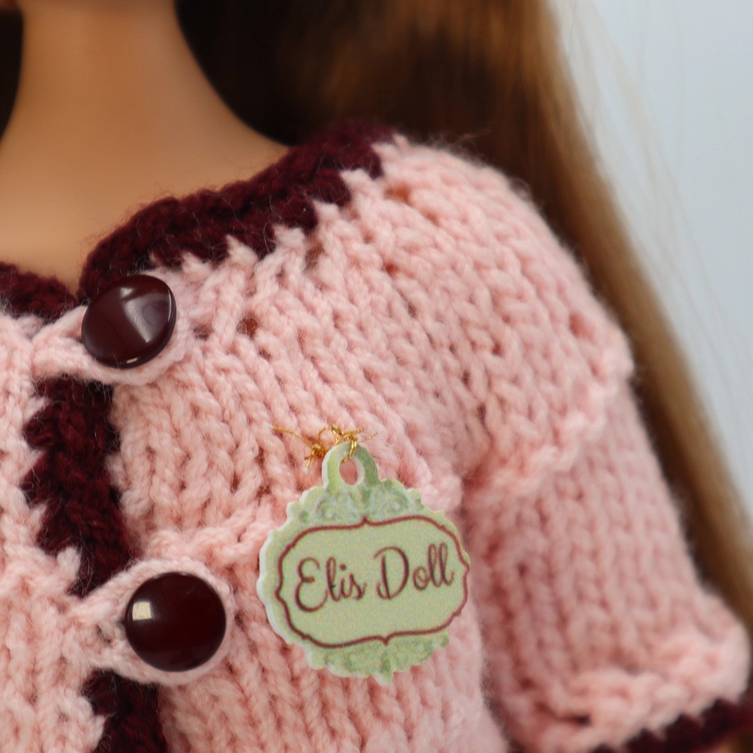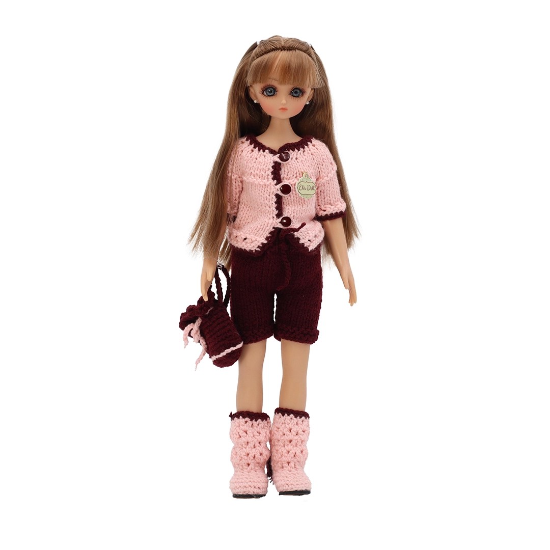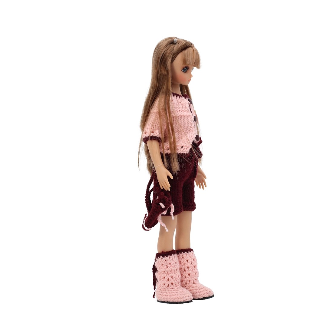 Muñeca de vinil, conjunto de sueter y bermuda, mochila y botas Tejidas colores vino y rosa.
