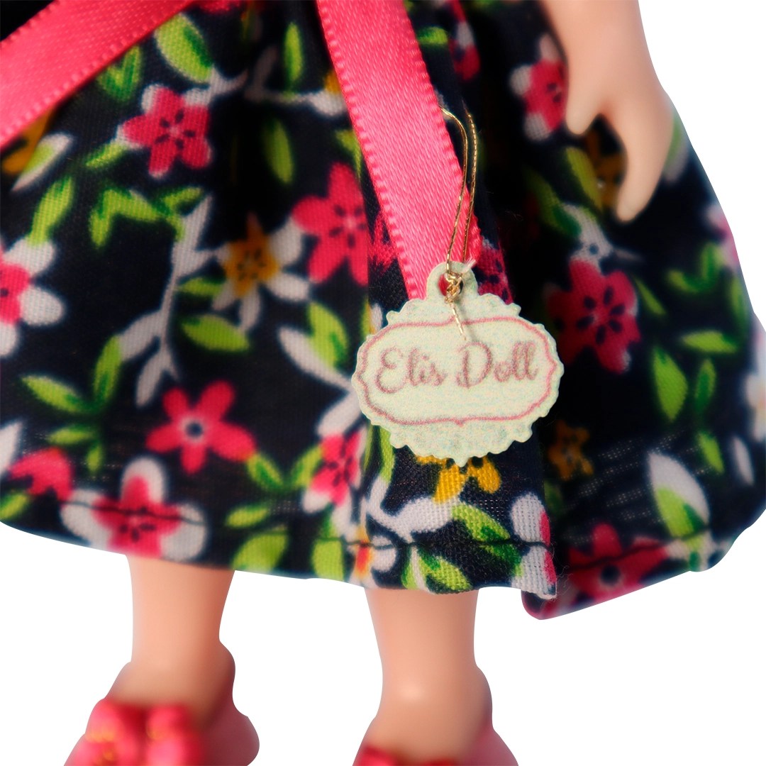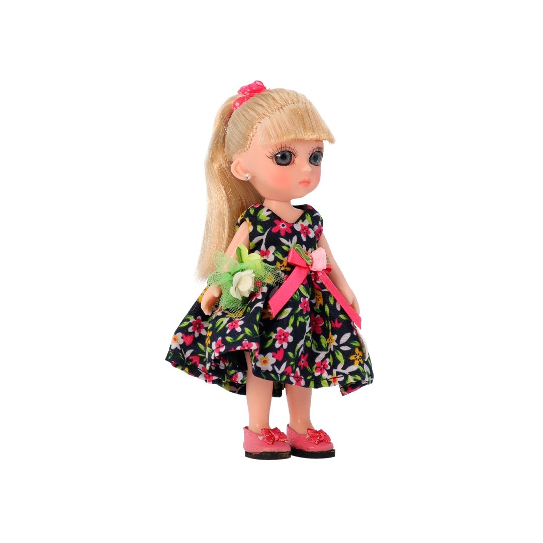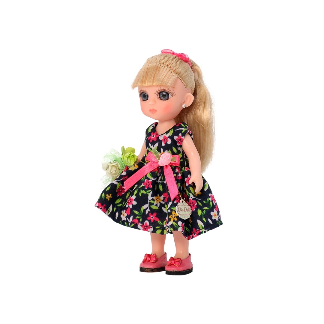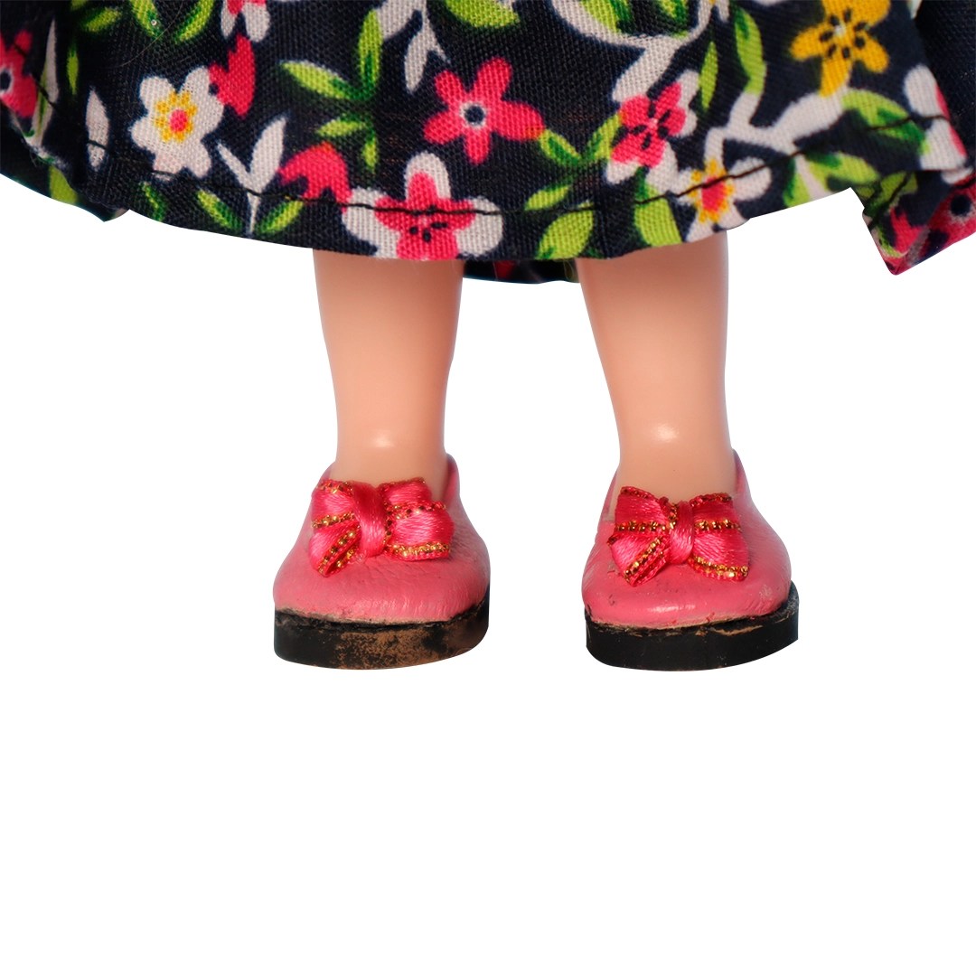 Muñeca de vinil, vestido negro/floreado, ramo, moño y flats cereza