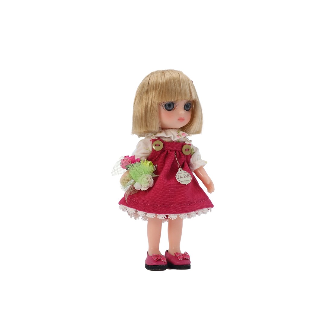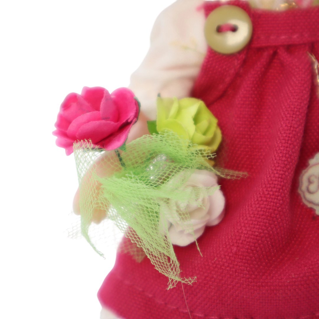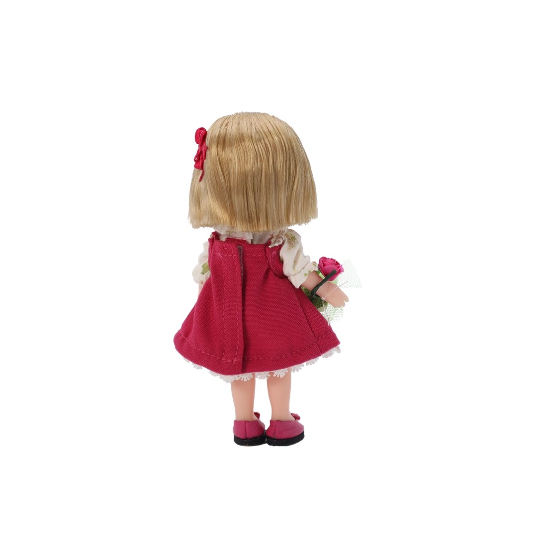 Muñeca de vinil, vestido fiusha, blusa ivory floreada, ramo, moño y falts fiusha