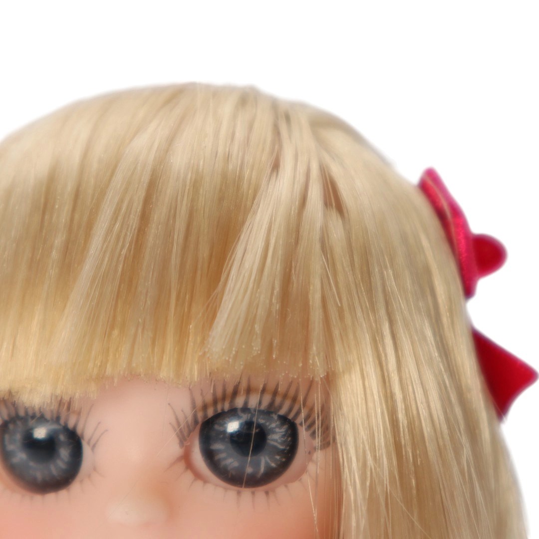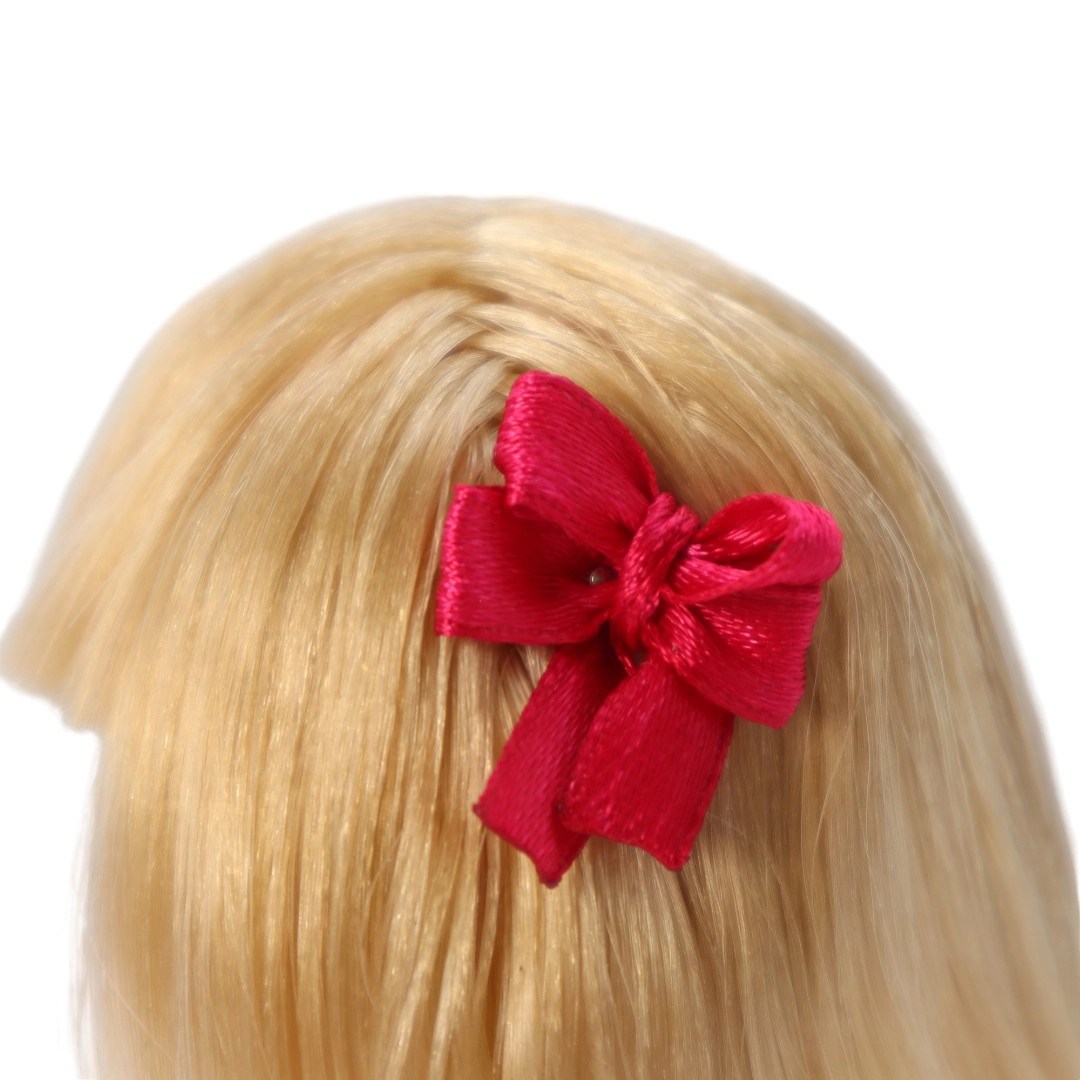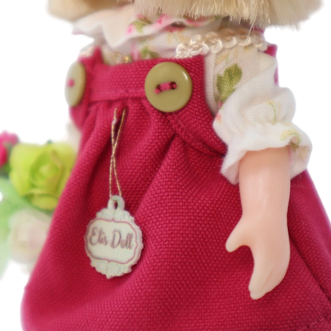 Muñeca de vinil, vestido fiusha, blusa ivory floreada, ramo, moño y falts fiusha