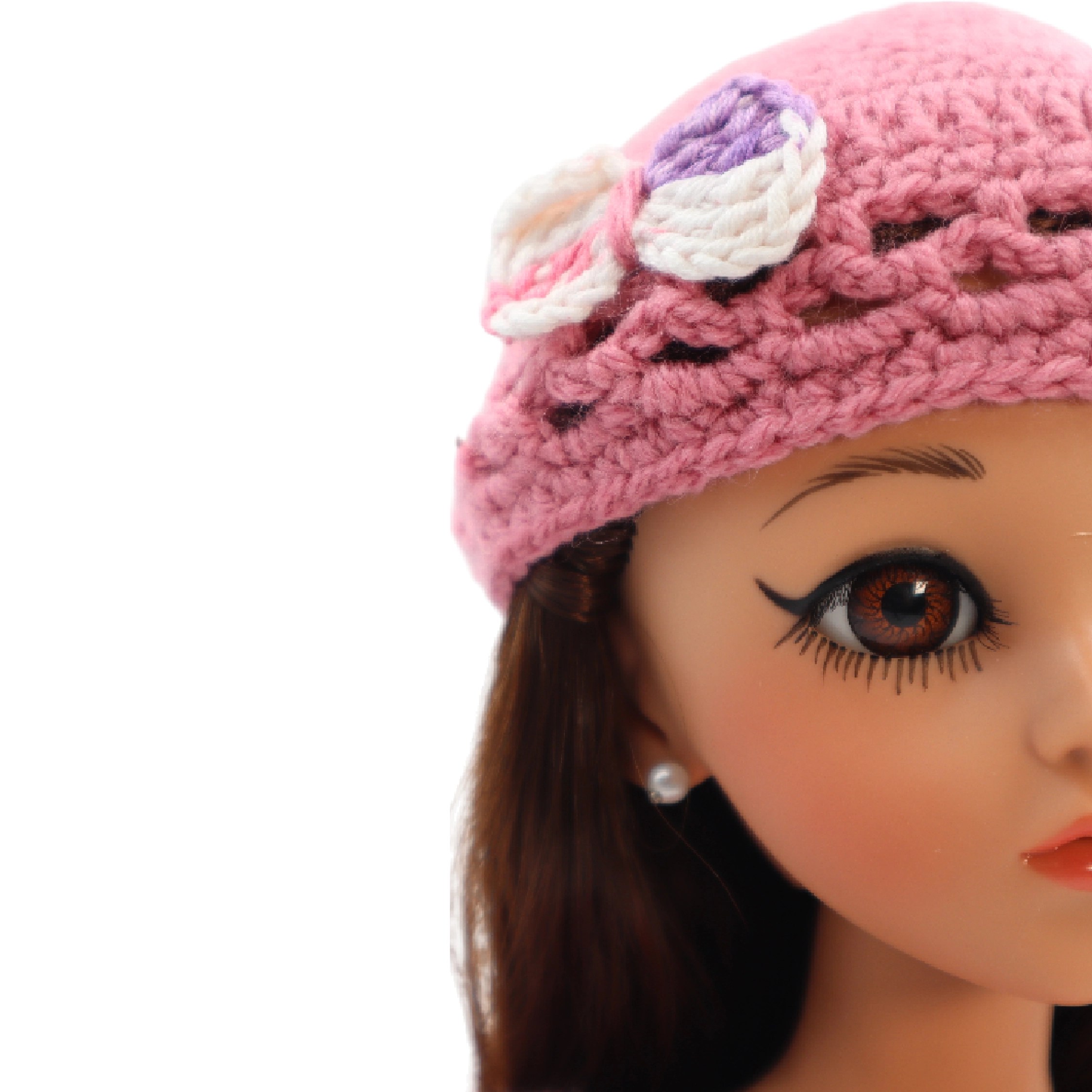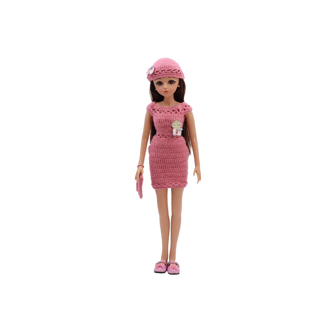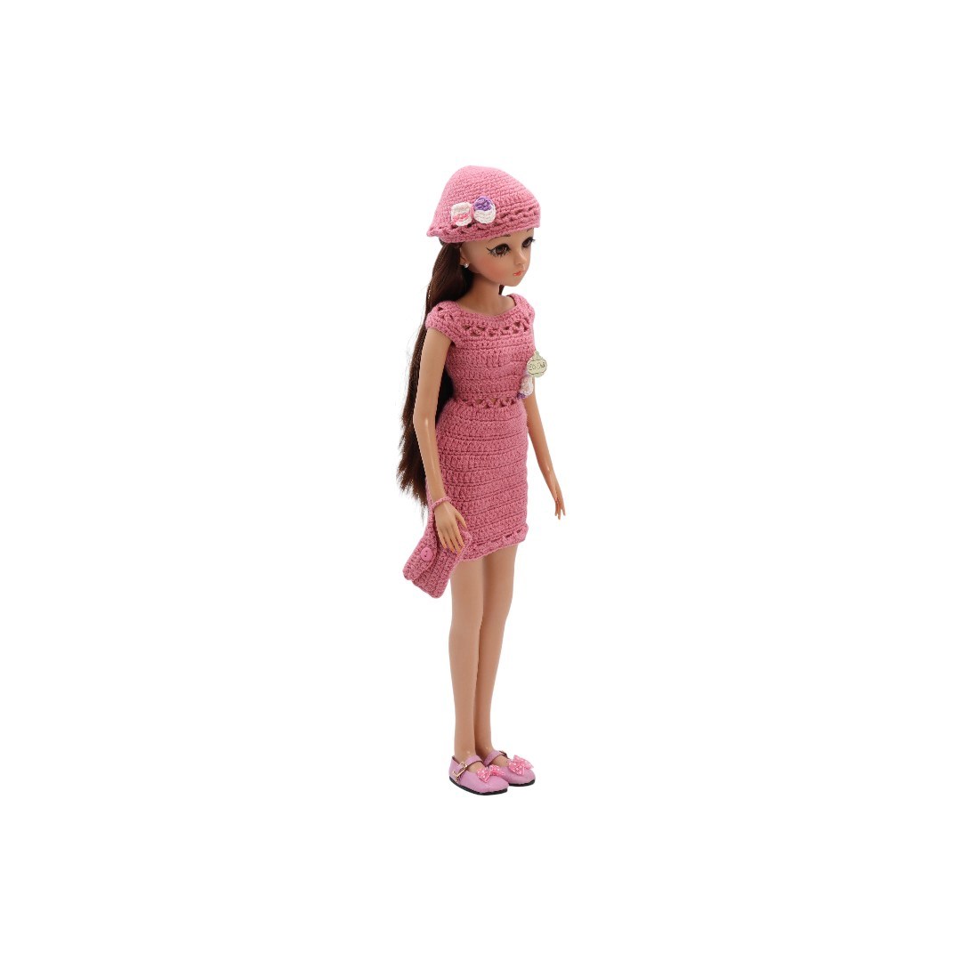 Muñeca de vinil, vestido, cartera y boina tejidos de color palo de rosa y zapato de piel color rosa.