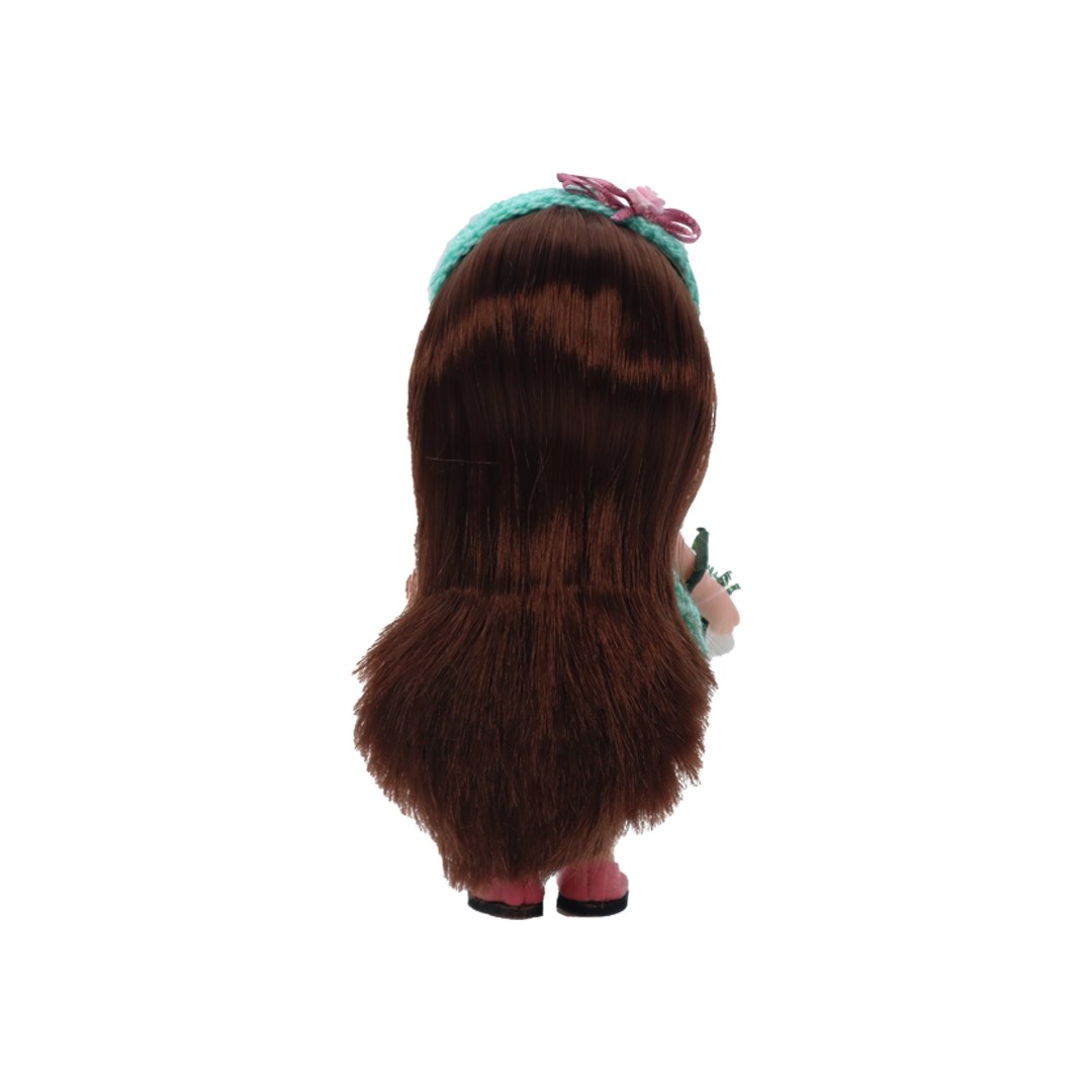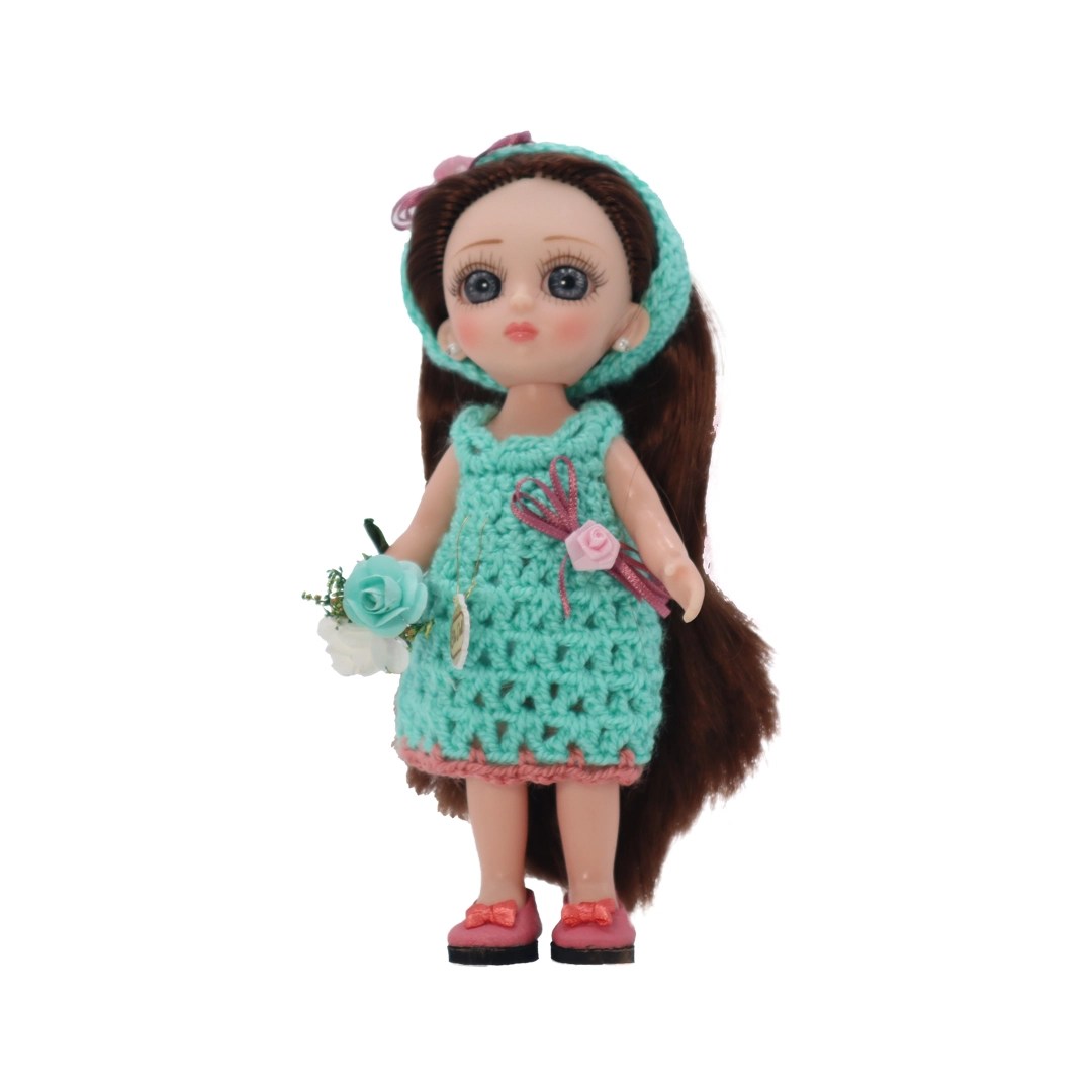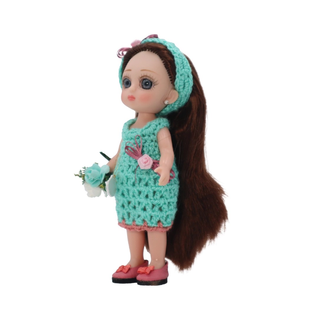 Muñeca de vinil, vestido y diadema tejidos menta/coral y flats coral