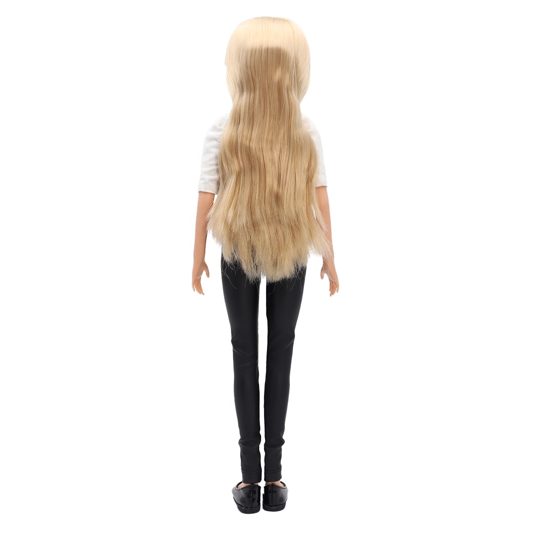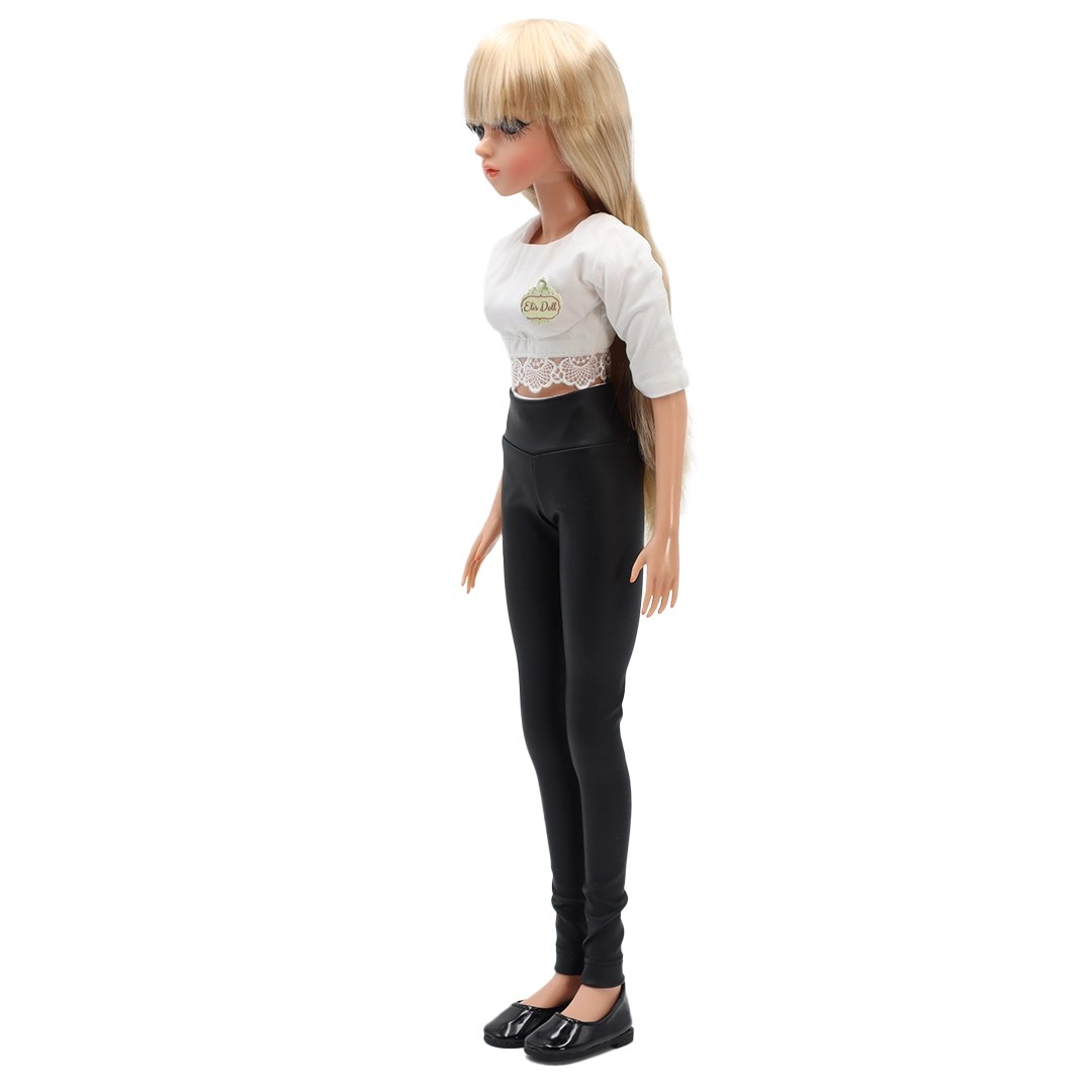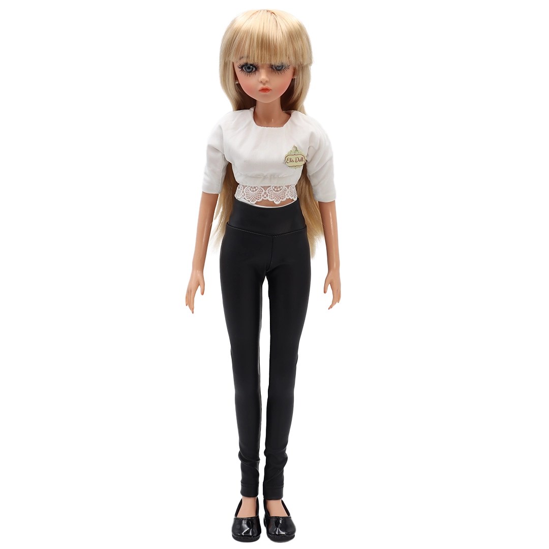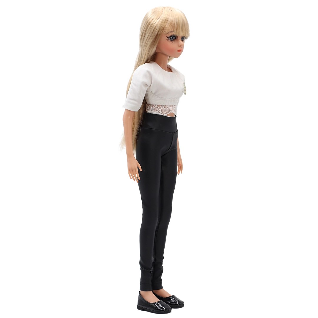 Muñeca de vinil, pantalón tipo piel negro, blusa blanca, rubia y flats negros