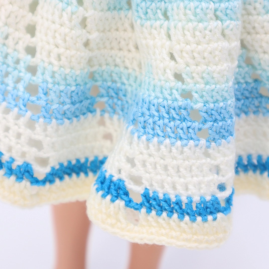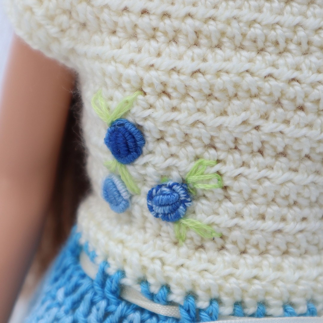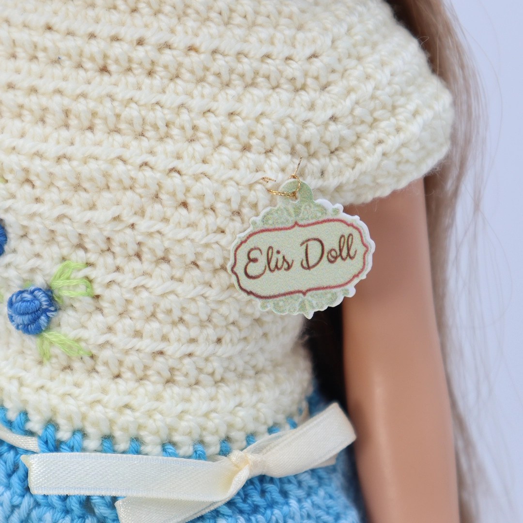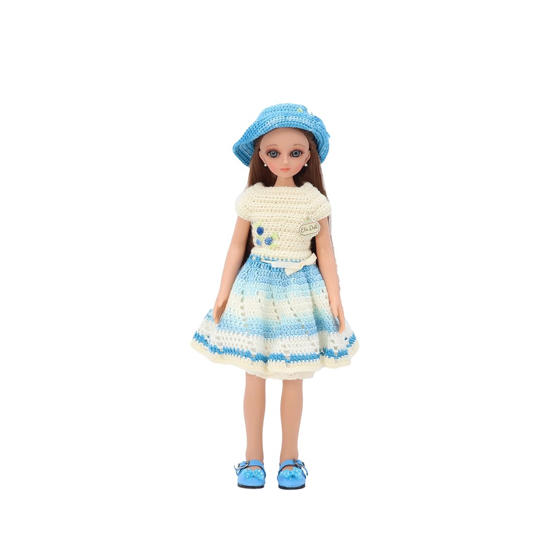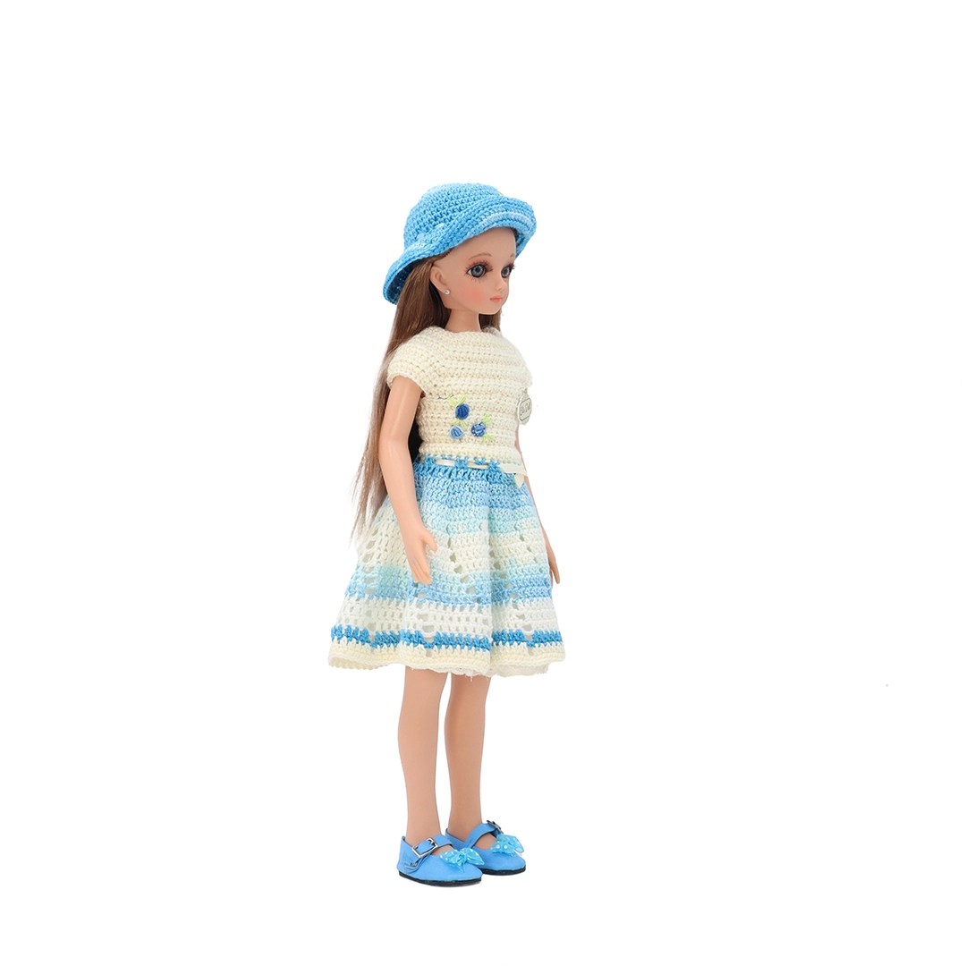 Muñeca de vinil, vestido y sombrero Tejidos colores Ivory y azul turquesa y zapatos color azul.