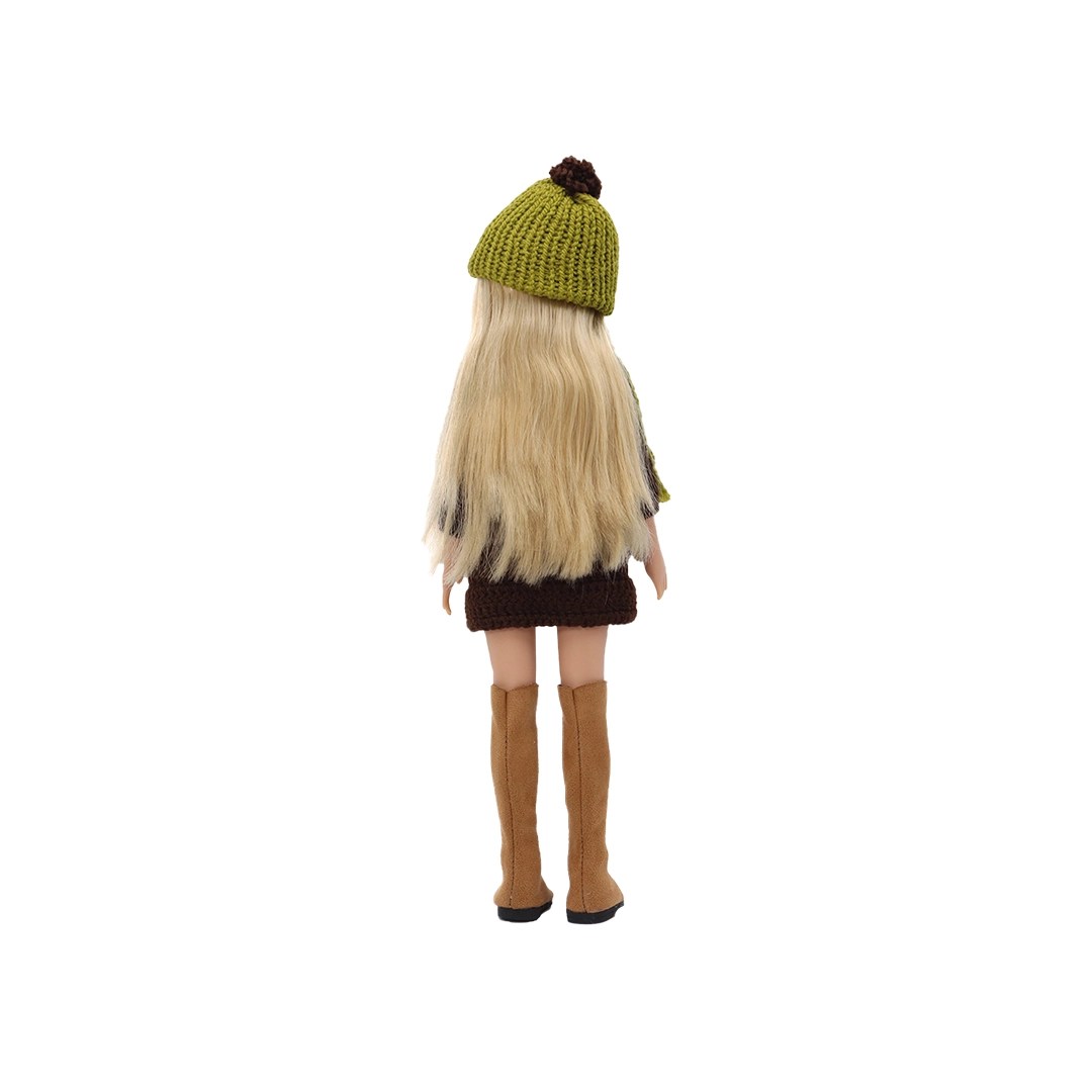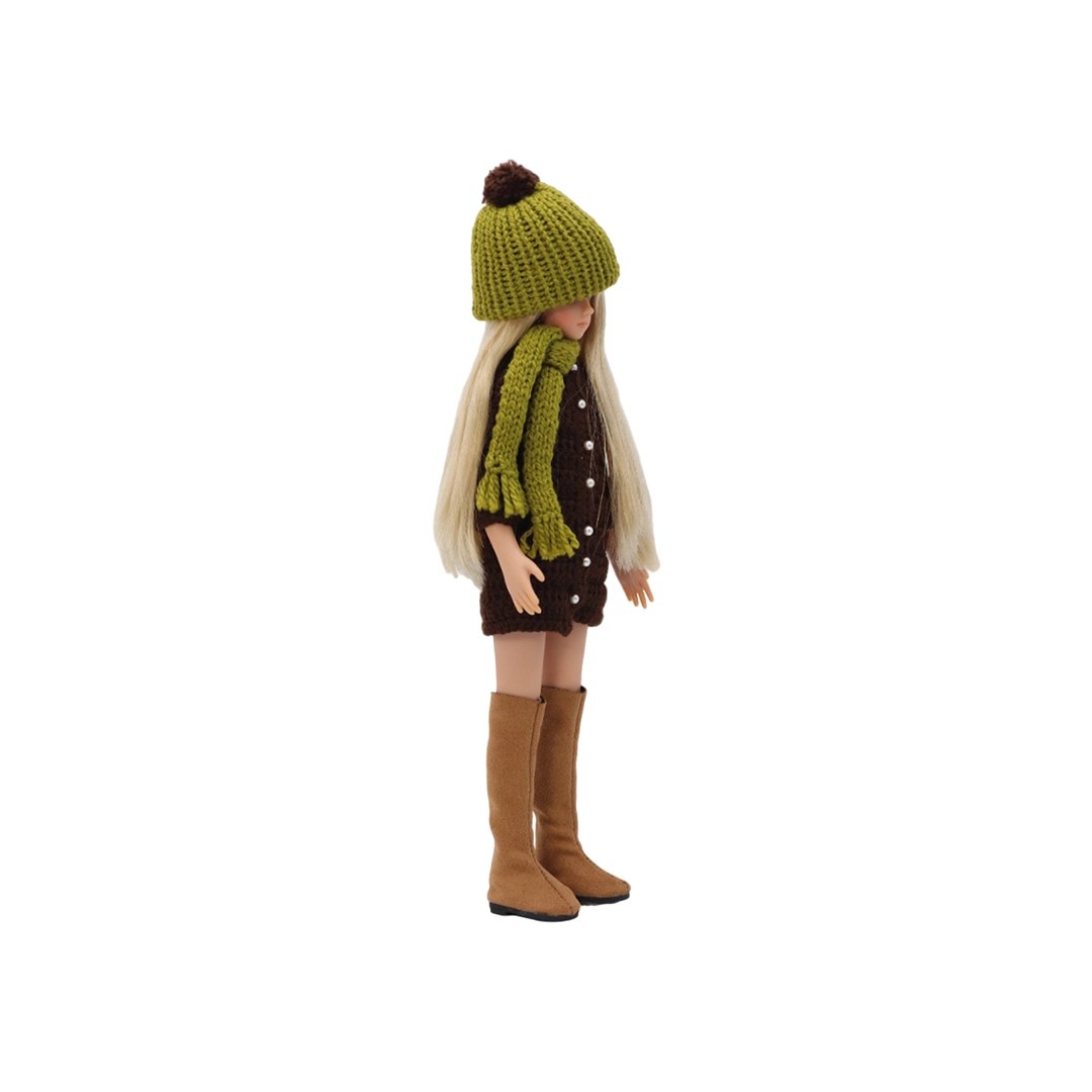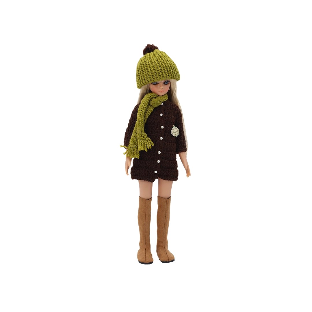 Muñeca de vinil, Abrigo café, gorro y bufanda verde tejidos y botas café