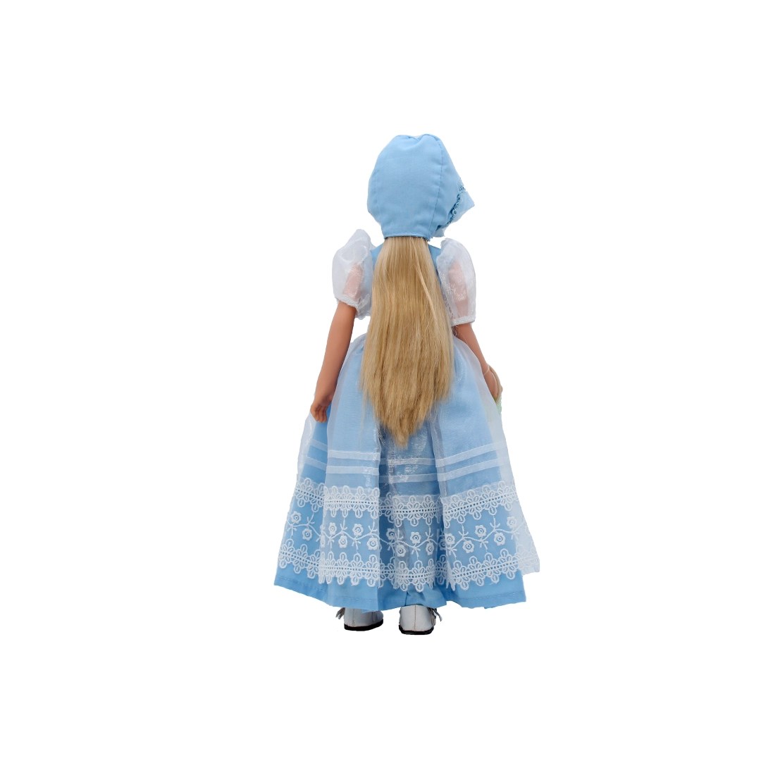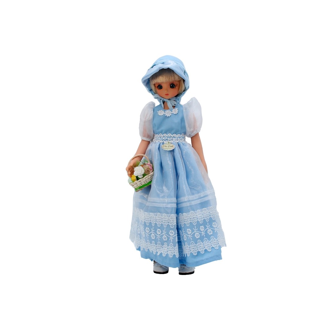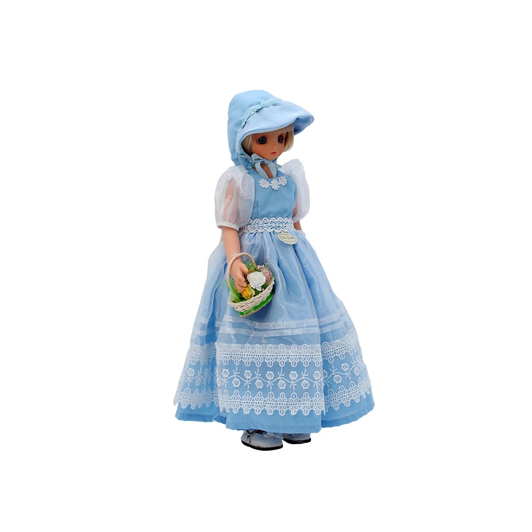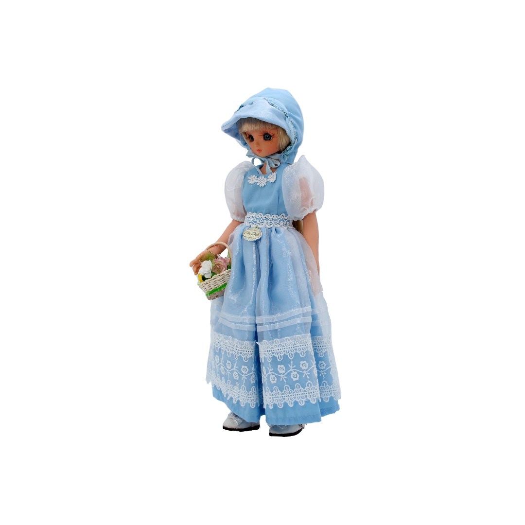 Muñeca de vinil, vestido y sombrero de organza color blanco y Azul, canasta con flores y zapatos color blanco.