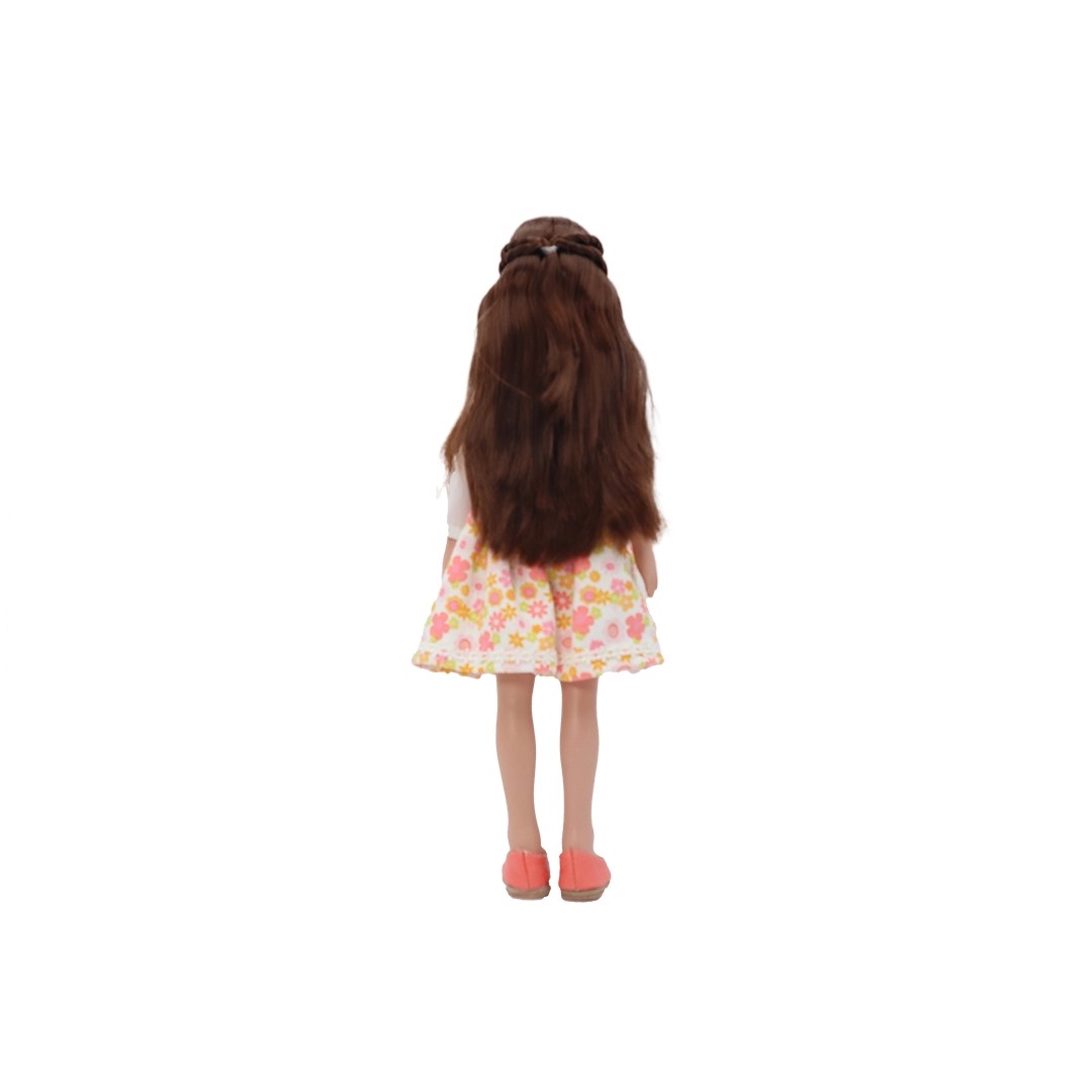 Muñeca de vinil, vestido estampado floreado y zapatos color salmón
