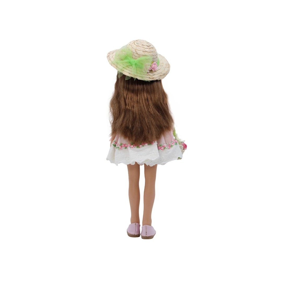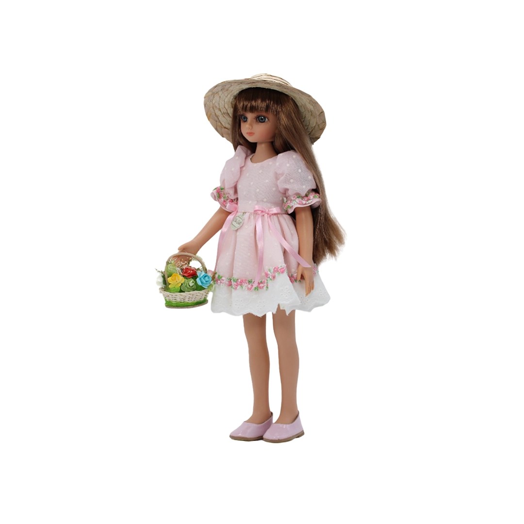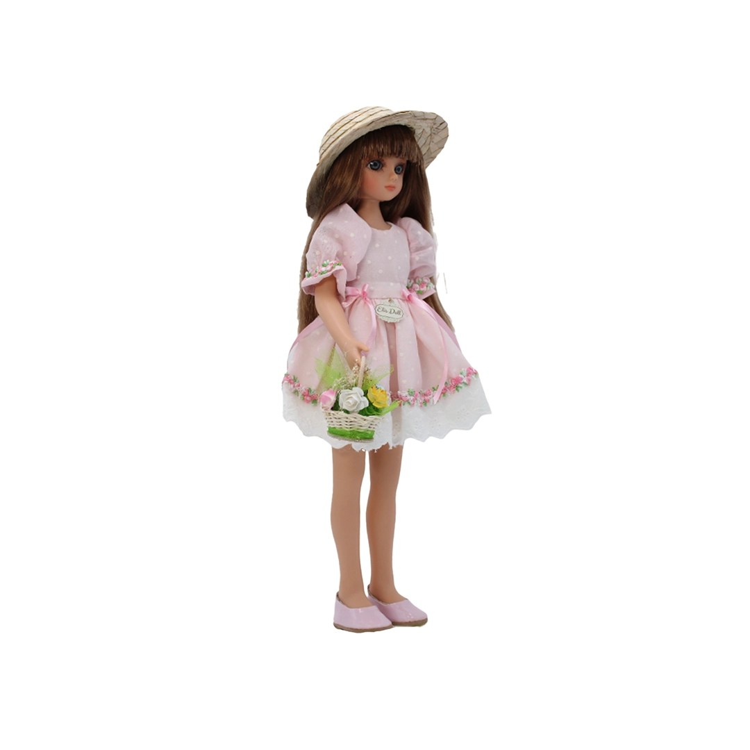 Muñeca de vinil, vestido color rosa con lunares blancos, sombrero, canasta con flores y zapatos color rosa.