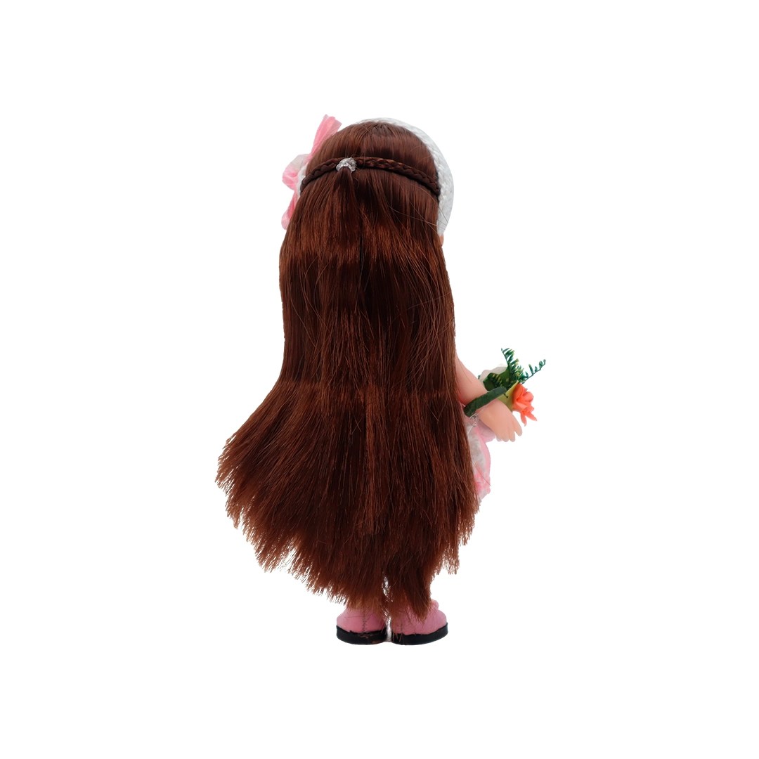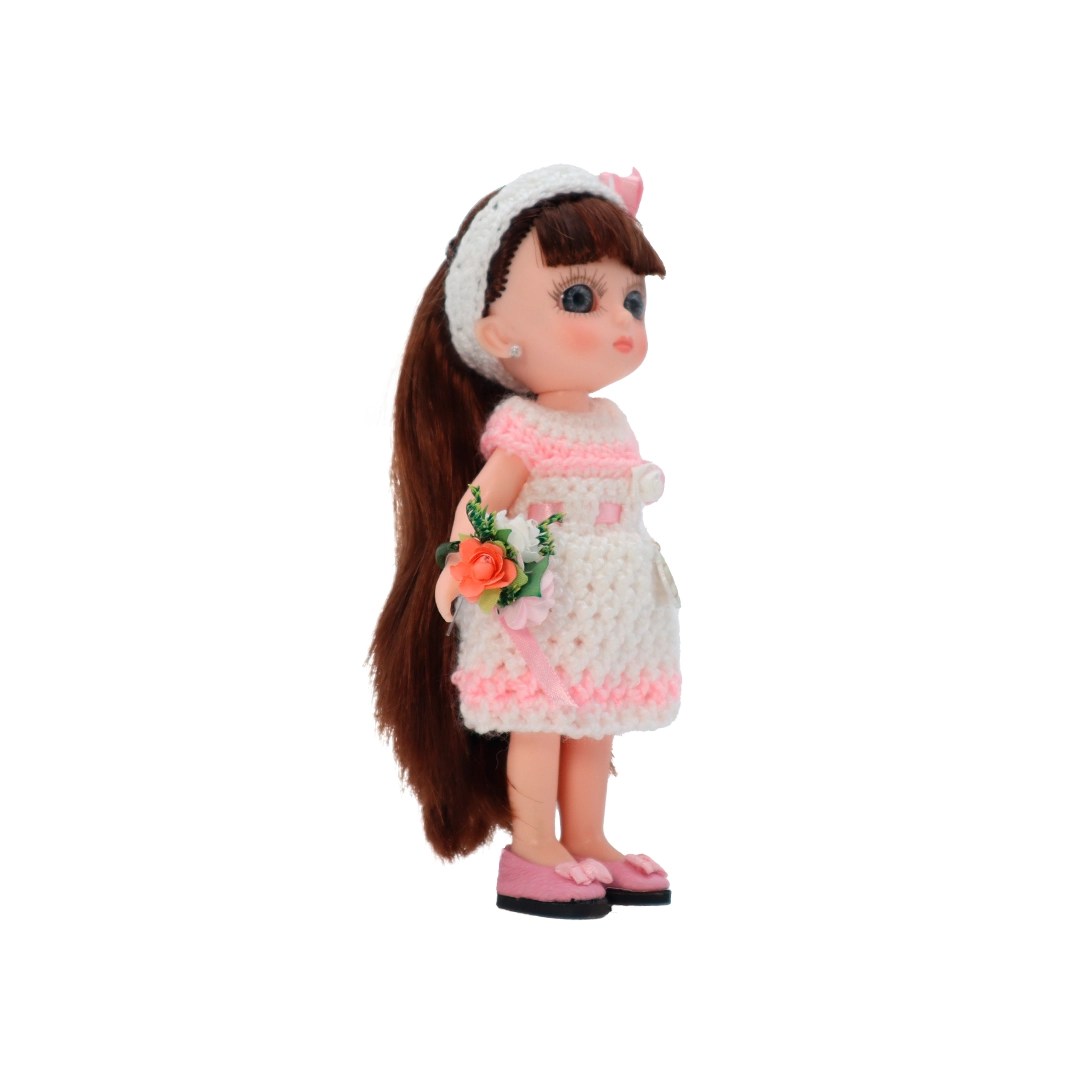 Muñeca de vinil, vestido y diadema tejidos blanco/rosa y flats color rosa