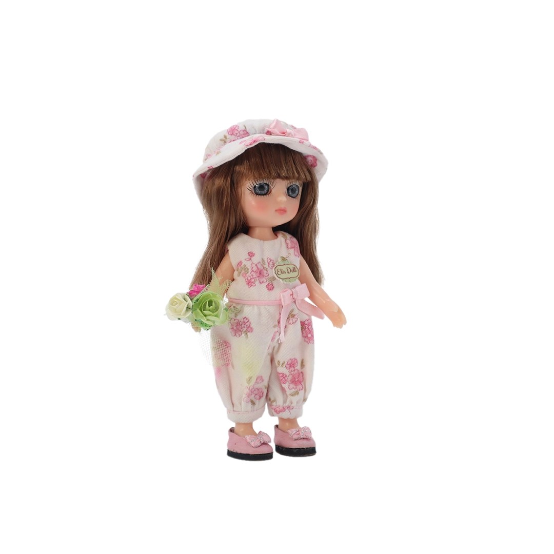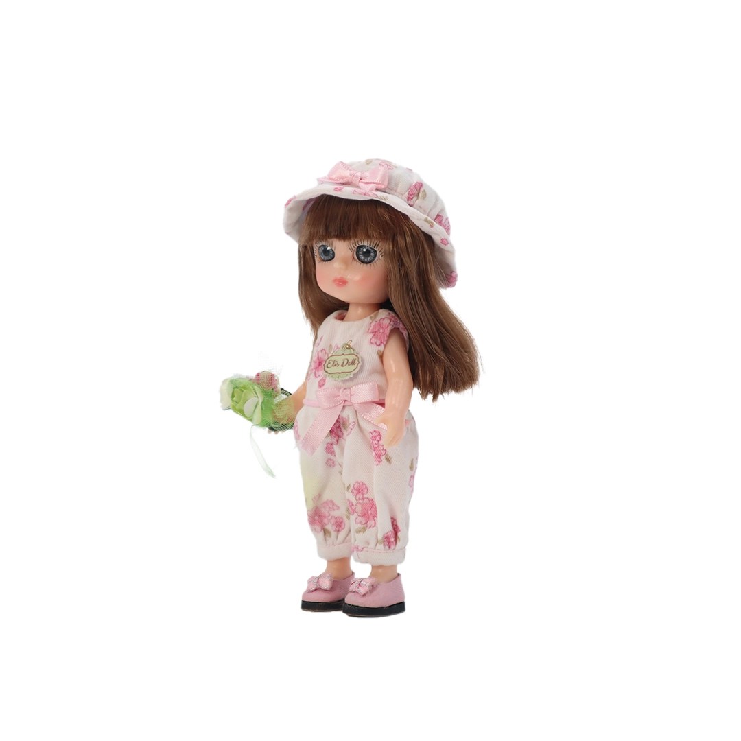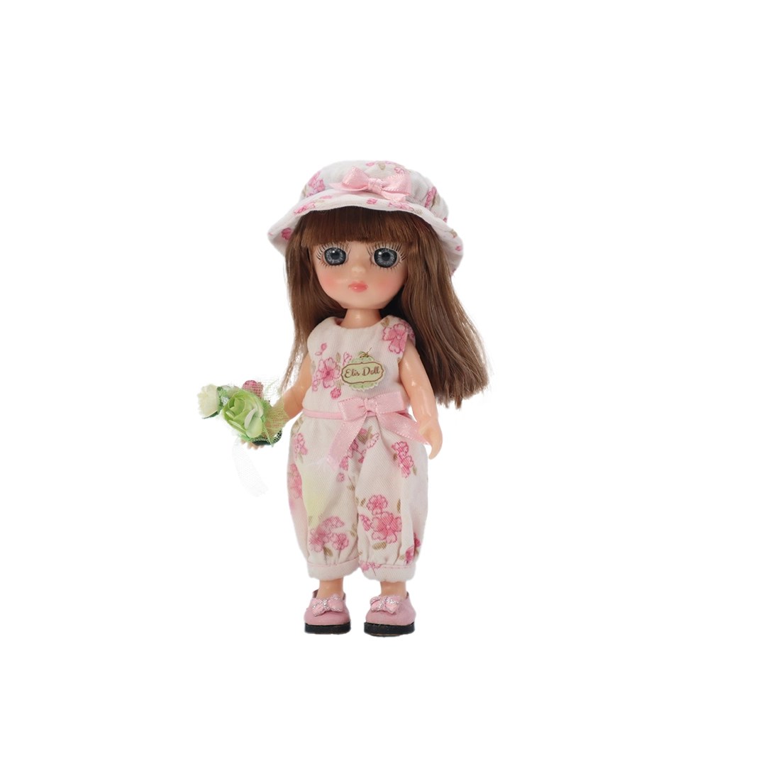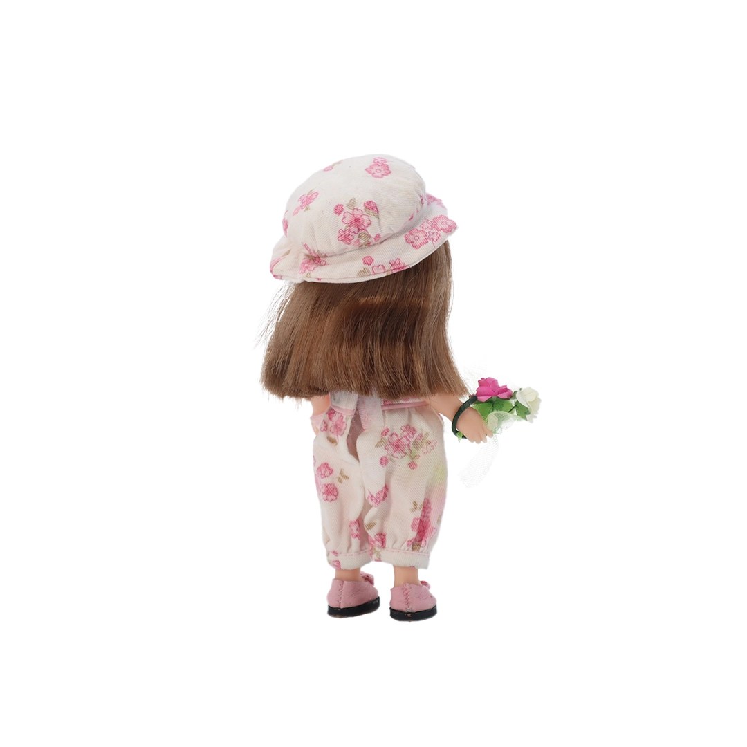 Muñeca de vinil, jumper floreado, sombrero, ramo, y flats