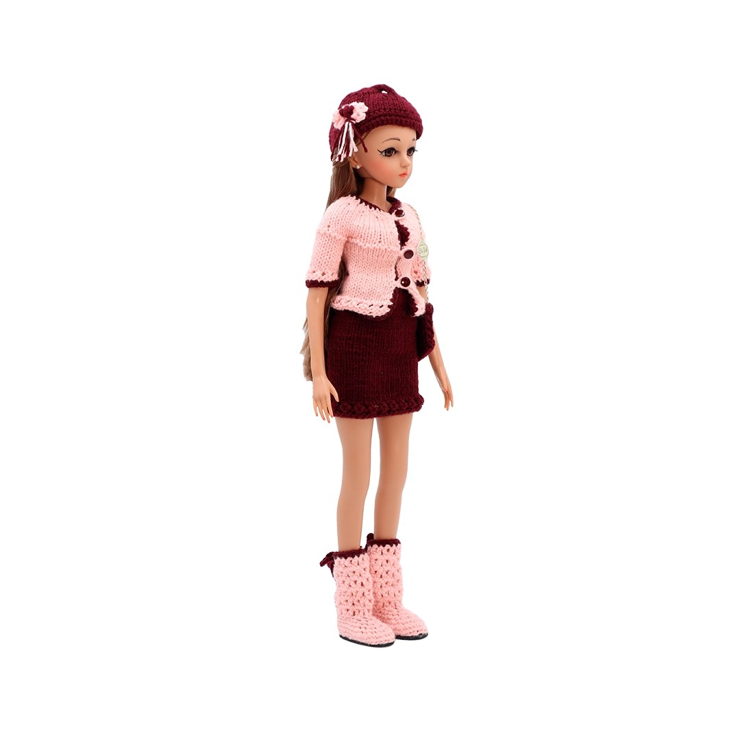 Muñeca de vinil, falda, blusa, boina, cartera y botas Tejidas en colores vino y rosa.