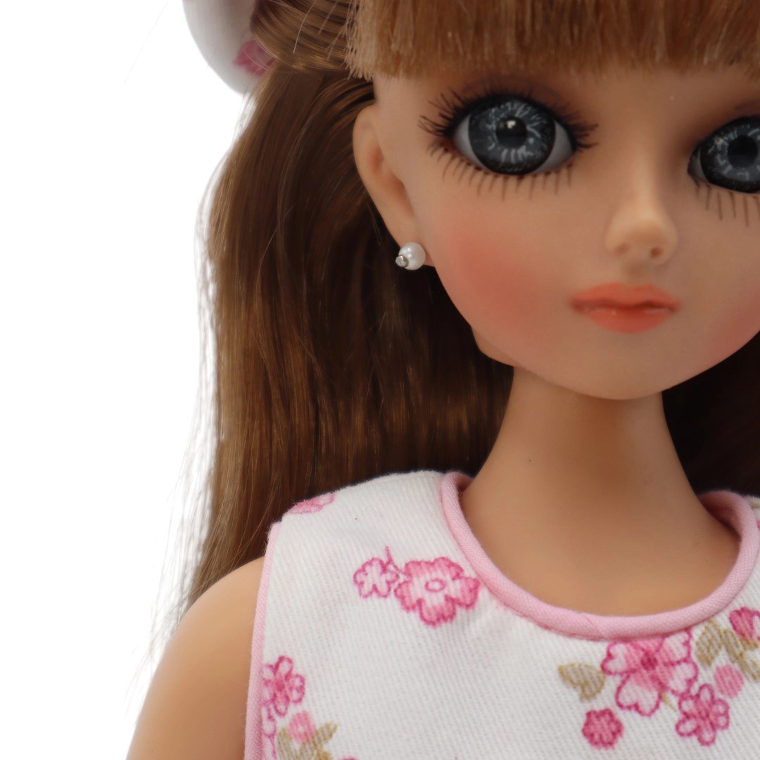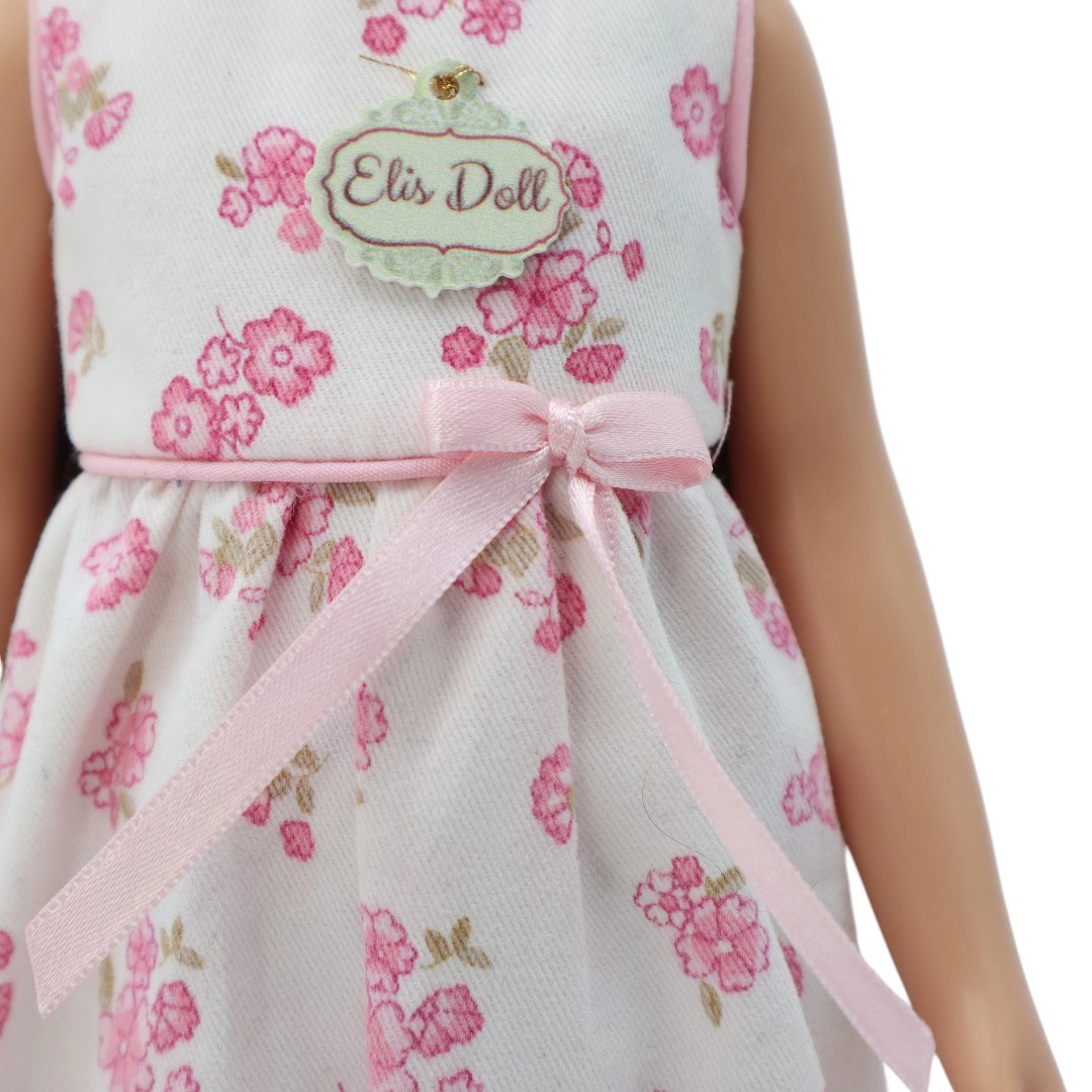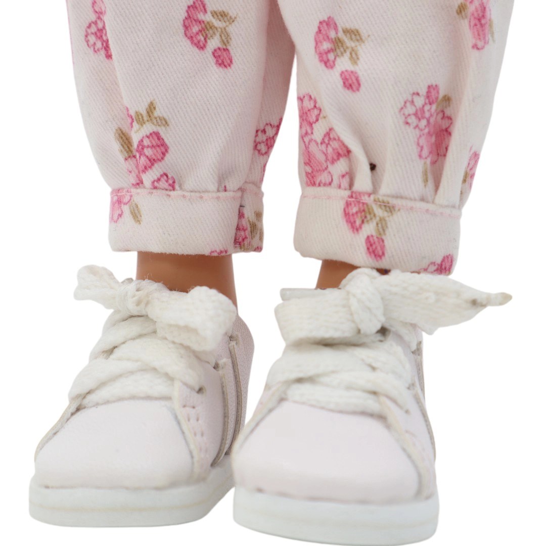 Muñeca de vinil, jumper rosa estampado de flores, sombrero y tenis blancos